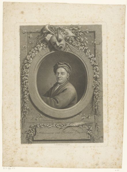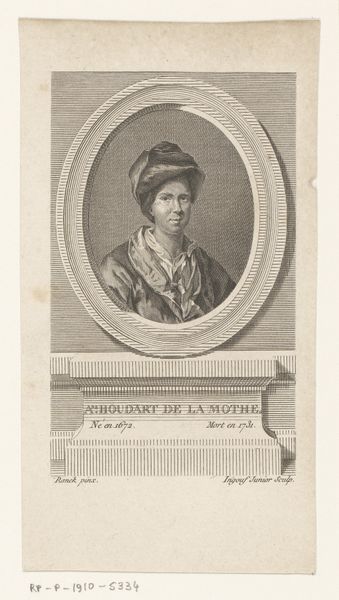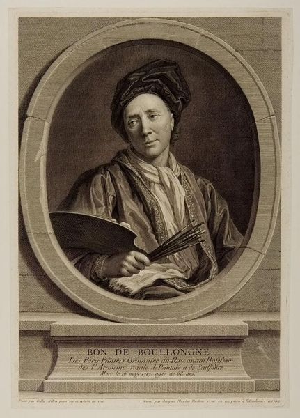 Editor: So, here we have Jacques Nicolas Tardieu's 1749 engraving, "Portrait of Bon Boullogne." I’m struck by the framing device – that carved oval. It’s quite grand, almost theatrical. How do you interpret this work? Curator: Theatrical is a great descriptor. It's important to consider the context in which this portrait was created. During the Baroque and Rococo periods, portraits served to legitimize status and power. Tardieu, through this print, isn't simply depicting Boullogne; he's participating in constructing and reinforcing his artistic persona and, more broadly, the authority of the French Royal Academy. Notice the inscription—emphasizing Boullogne’s titles. Where does that place the image, socially and politically? Editor: It certainly places him high up, part of the Royal patronage system! I guess it's not just about Boullogne as a man, but his role within a very structured art world. Curator: Exactly. The Royal Academy wielded immense power in defining artistic standards and controlling access to opportunities. Engravings like these helped disseminate an artist’s image and bolster their reputation within the artistic establishment and to a broader public. How do you see that relationship play out here? Editor: The controlled lines, the almost idealized portrayal... it all seems to promote an image of artistic mastery that aligns with the Academy's values. A subtle but definite power play, really. Curator: Precisely! And in understanding that power play, we can unpack the social function of even what appears to be a simple portrait. The image isn’t merely descriptive. It’s persuasive. What's been most insightful for you here? Editor: How a seemingly straightforward portrait is entangled with social structures and power dynamics! It really changes the way I look at images. Curator: Indeed! Examining these historical and institutional factors really enriches our appreciation and understanding.