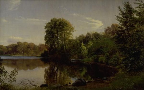Editor: Here we have Efim Volkov's "Landscape with a Pond," painted in 1887. The artist uses oil on canvas, capturing this stunning waterside scene. It strikes me as profoundly peaceful, yet… almost melancholy? What draws your eye to this piece? Curator: Ah, yes, that subtle melancholy – it's the soul of the Russian landscape, isn’t it? To me, it whispers of Turgenev's prose, that same delicate observation of nature imbued with human emotion. Notice how Volkov hasn't romanticized the scene. It's not idealized; there's that old barrel in the foreground, a testament to the human touch, perhaps a reminder of labor, groundedness. Editor: That barrel really does stand out now that you mention it! Almost feels out of place in such a serene setting. Curator: Precisely! And is it out of place, or an essential part of the landscape's story? I suspect it adds a touch of realism against the dreamy brushstrokes depicting light reflecting on the pond. It roots the dream, so to speak, makes it less fleeting, more tangible. Do you catch the tiny figure of the person on the pier? A splash of color and implied human interaction Editor: Now that you point them out, that changes everything; a quiet reminder of our place within nature. So much more than just trees and water! Curator: It’s about finding beauty in the ordinary, the way light dances on water, and how a simple scene can echo profound emotions. Isn’t it wonderful how art can evoke so many interpretations? Editor: Absolutely. I came expecting trees and water, but I'm leaving with so much more! The beauty of art always delivers.