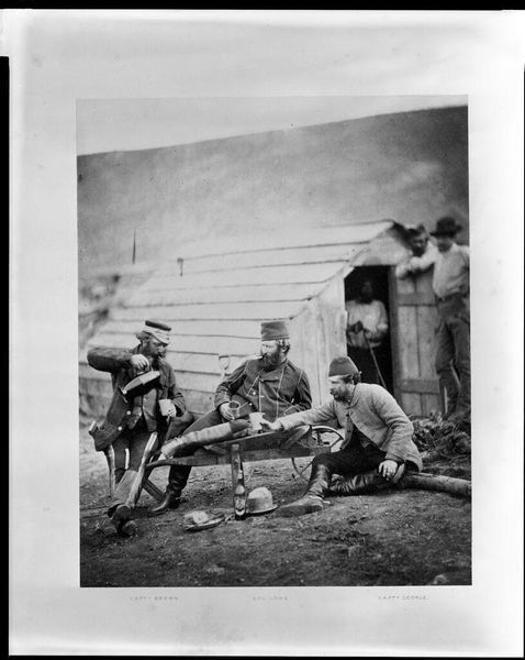 Roger Fenton’s photograph, *Hardships in the Camp,* captures a seemingly candid moment, using albumen silver print. The sepia tones imbue the scene with a sense of nostalgia and distance, softening the harsh realities of military life. Three men are gathered, their forms arranged in a pyramidal composition that provides a structured stability to the image. The eye is drawn to the interplay between the light and shadow, delineating the contours of their faces and clothing. This use of chiaroscuro not only adds depth but also highlights the texture of their uniforms, suggesting a tactile quality despite the photograph's two-dimensionality. The scene is carefully arranged with props and poses that appear natural, yet the overall composition reveals a constructed reality. Fenton uses the semiotic language inherent in the setting and subjects, creating a narrative about camaraderie amid hardship. The formal balance achieved by the arrangement of figures and props lends a sense of dignity and order to an environment typically associated with chaos and deprivation. This photograph functions as a cultural artifact, prompting ongoing interpretations of its historical context.