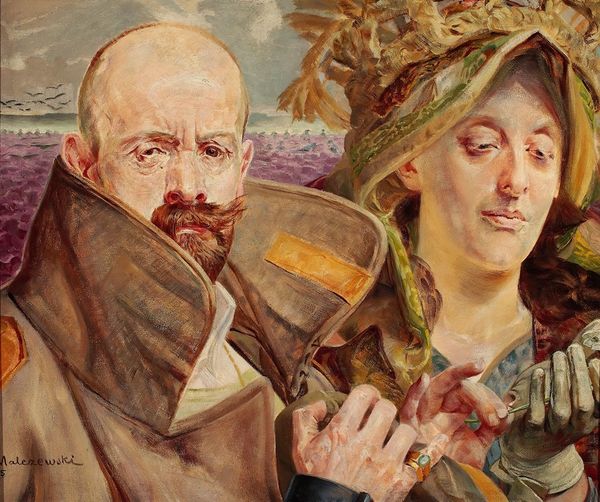 Jacek Malczewski created this self-portrait in 1915, a canvas imbued with symbols that echo through the corridors of time. The radiant figure beside him, crowned with a star, brings to mind classical depictions of celestial beings—a guiding muse perhaps, or a symbol of divine inspiration. This iconography, rooted in ancient beliefs, reappears throughout art history. Consider the winged victories of antiquity, or even the star-adorned figures in Renaissance paintings. Here, however, the angel seems to be related to a different archetype, with a psychological resonance: a guardian spirit who watches over and guides the artist through turbulent times. Such symbolic gestures are not static; they evolve, absorbing the anxieties and aspirations of each era. As you gaze upon Malczewski's angel, remember its countless iterations. It’s a powerful reminder of how cultural memory reshapes itself in art.