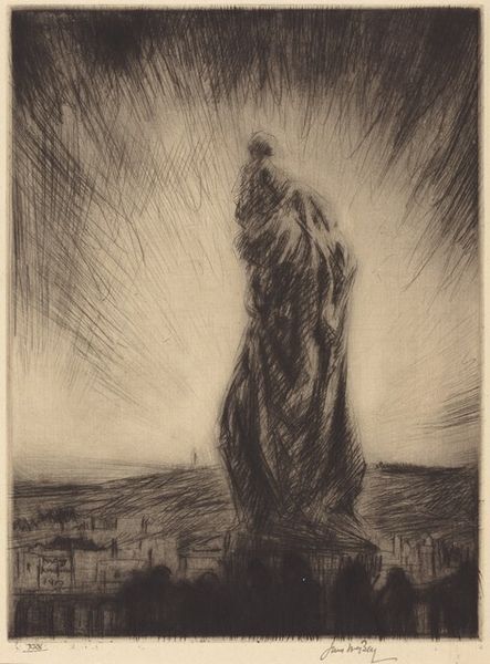 Curator: Ida Ten Eyck O'Keefe created this work titled "Evening" in 1935. It’s an etching. What are your initial impressions? Editor: The mood is immediately somber. A lone figure stands against a vast, empty landscape under a dramatic sky. It feels very isolated and weighty. Curator: Indeed. Considering that this is an etching, the textures and the play of light are key. Notice how O'Keefe manipulates the density of lines to create depth and volume. The hills, for instance, have a tactile quality. I am thinking of the cultural context and availability of materials that led to this kind of printmaking taking root. Editor: The figure, though small, really dominates the narrative. Their silhouette and placement—almost swallowed by the land—evokes a sense of vulnerability, or perhaps quiet defiance. This evokes for me a universal symbol of humanity facing something larger than itself. Is there a narrative being hinted at? Curator: It is open to interpretation. Considering the period, the work touches upon anxieties about the human place within modern landscape. Editor: So it's not simply representational. It makes me think about visual symbols of loss and hope that continue to resonate even today. The stark beauty has a certain power, and maybe the figure is less defeated than enduring. Curator: The landscape itself speaks volumes. It is almost a character in the etching. And think about the labour involved, each of those tiny etched lines required dedication. Editor: A fascinating insight, indeed. Thinking about those textures that stand out, perhaps a deeper exploration into the symbolic implications of its imagery may reveal insights into both cultural history and universal narratives of survival. Curator: An engaging intersection of image, and production - providing us a fascinating moment. Editor: It offers a timeless visual encapsulation of existential human drama.