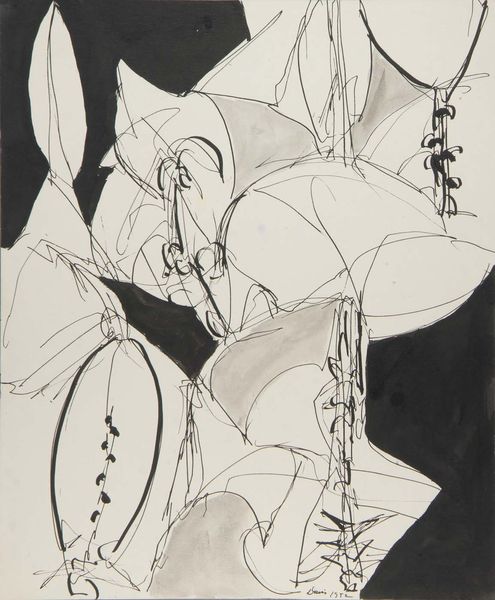 Editor: Here we have "Femme Star and Hands," a drawing in ink by Anton Prinner. It’s hard to pin down the exact date it was created. The drawing feels so stark and unsettling with that angular, almost alien, figure and all those hands! What's your read on a piece like this? Curator: Well, immediately, I'm drawn to how this image might be reacting against, or even critiquing, established power structures. Consider the context – what societal norms, political landscapes, or art historical traditions might Prinner be engaging with? The use of stark lines, almost like woodcuts, pushes it into a more modernist field, but one with direct ties to folk art. Does it feel almost… oppressive to you? Editor: Oppressive is a good word. The hands feel grasping, and the figure itself, although appearing as a "star," seems trapped or manipulated by them. Curator: Exactly! Hands often symbolize agency, control, or even divine intervention in art. Here, though, they're multiplied, maybe distorted. It brings up questions about who has control and to what extent. Are they helping or hindering the central figure? And, thinking about the 'femme' in the title, does that then comment on the expected role, particularly of women, within specific cultural norms or power dynamics of the time? What do you think? Editor: That really changes my view. I hadn't considered the "Femme" title quite so explicitly. If those hands *are* representative of society… Wow. That makes it a lot darker. Curator: And it demonstrates how art becomes a dialogue within a much broader societal discourse. The beauty of viewing this image in a contemporary gallery now lies in how viewers today might react, re-interpret or find entirely different meanings when faced with this kind of visual argument. Editor: So, it is about what the artwork represents AND what discussions it promotes in varied societies! Thank you. Curator: Precisely! The layered meanings inherent within an artwork are forever altered by public interpretation.