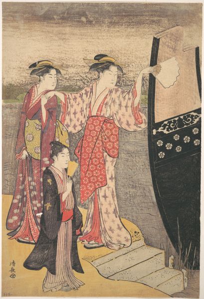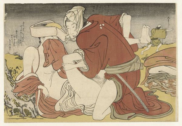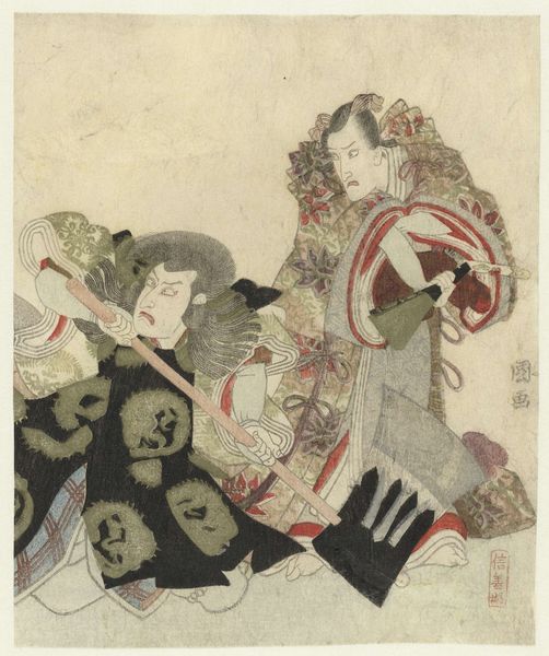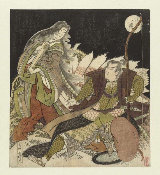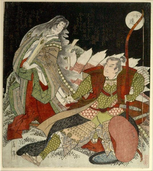 Yashima Gakutei's woodblock print presents a spectral scene dominated by a stark contrast between light and shadow. The dark background accentuates the figures of Tamamo no Mae and Miura Kuranosuke, drawing us into their tense encounter. The composition is structured around the interplay of sharp lines and flowing forms. Miura, rendered with angular determination, confronts the ethereal Tamamo, whose form dissolves into wisps of spectral energy. The patterns on their garments, intricate and precise, contrast with the smooth, dark void behind them. Gakutei’s use of line suggests not just form, but also the dynamic tension between the characters. Semiotically, the print operates on multiple levels. Tamamo's ghostly appearance and the archer's resolute stance are visual cues that tap into cultural codes of the supernatural and the heroic. The moon, positioned above the archer, might symbolize clarity and destiny in the face of deception. This print destabilizes the boundary between the visible and invisible, inviting us to contemplate the shifting nature of reality and representation.