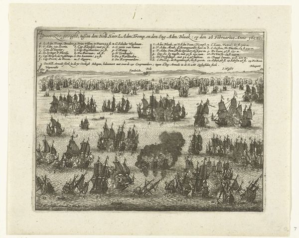 Curator: This detailed engraving is entitled "Aankomst van Van Spilbergen te Batticaloa op Ceylon, 1602," and was created sometime between 1603 and 1646 by Floris Balthasarsz van Berckenrode. It depicts the arrival of a Dutch fleet in what is now Sri Lanka. Editor: The detail is astounding! But, if I'm being honest, my first impression is of a toy town being invaded. The people look like tiny figures, almost Lego-like, amidst the architectural details. Curator: It's the perspective, isn't it? Almost bird's-eye view, like a strategic map, really emphasizing that feeling of surveying a territory. That style was fairly typical of Dutch Golden Age prints. Berckenrode captures the ambition and perhaps the clinical detachment of early colonial endeavors. Editor: Exactly! The arrival is portrayed in such an orderly way. We see the marching soldiers, and the elephants in an almost parade-like formation—a very deliberate visual of power. But how much does this sanitized image distort the actual complexities of the landing? I see the neat rows and can't help but question the lived experience. Curator: You bring up a critical point about the image as a narrative construct. Remember, this print was created to project a certain image of Dutch prowess, a show of force designed to impress viewers back home. The elephants are definitely there as exotic props reinforcing that image, even while potentially signaling other implications of the historical context. Editor: I also wonder about the absence of local perspectives here. It is as if the people are part of the architectural display. Where are their stories in this 'history painting'? What kind of negotiation, and very likely, resistance was occurring? These silences within the detailed scene speak volumes about the selective nature of historical documentation. Curator: Absolutely. And seeing it with fresh eyes makes one consider the loadedness of maps and other tools used to visualize a colonizing culture’s sense of space, conquest, and belonging. It makes this piece resonate powerfully beyond just a historical snapshot, a fascinating and sobering study on perspective. Editor: It makes one consider how such prints further cemented skewed perspectives on cultural exchange in the popular imagination back in Europe and still impacts geopolitical relations now. It makes it clear how far we need to evolve still in our own self-awareness and in how we contextualize the legacies of colonialism.