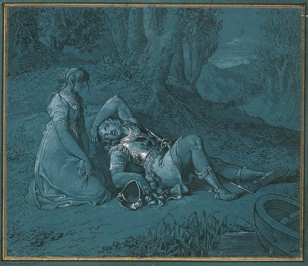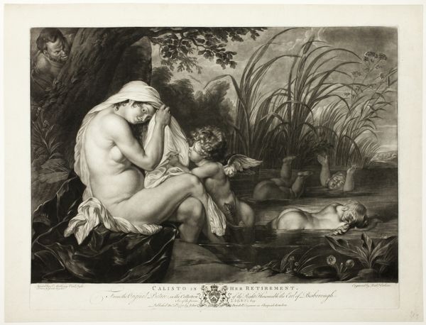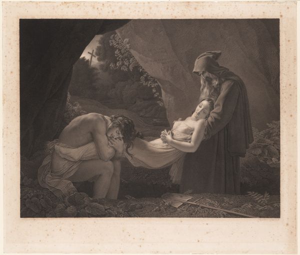 Curator: The first thing that strikes me is the stark contrast between the warm, vibrant red of the soldier’s coat and the muted greens and browns of the surrounding landscape. It feels unsettling. Editor: Indeed. We are looking at “The Dead Soldier,” attributed to Joseph Wright of Derby. There’s no exact date associated with it. It’s rendered in oil paint, portraying a rather somber scene. Curator: The narrative here is so potent. Look at the drapery that creates a makeshift shelter. And a cannon barely visible in the background. This is clearly a scene born of conflict and scarcity. How does Wright utilize such meager materials, oil on canvas, to convey so much? Editor: Precisely! And note how Wright chooses to depict the aftermath, not the battle itself. This decision shifts the focus from the spectacle of war to its intimate consequences. Consider also how genre painting gained traction in British art circles at this time, aligning with wider discussions regarding national identity. The social fabric being torn apart becomes a fitting and very tragic symbol. Curator: The socio-political undertones can’t be missed. We see a mother, exposed, vulnerable, offering comfort and care, a stark contrast to the detached, stoic narratives often glorified within the historical canon. Were these canvases intended as direct social commentary and hung in specific exhibition spaces for the bourgeois to see? Editor: In terms of the consumption of the work, these kinds of history paintings, even if verging on genre scenes, were often circulated amongst the growing middle class as engravings or displayed within private collections that further fuelled artistic reputation and financial gains. Consider also Wright's interest in enlightenment ideals and scientific rationalism, often at odds with military conflicts. Curator: And I wonder if Derby's access to pigments during his time impacted his color choices; that red pops intensely compared to the muted earth tones. Or whether Wright's method involved a carefully applied sequence of paint layers. The fabric folds and his skin both contrast. Editor: Exactly! The interplay of public imagery, personal expression, and historical events shapes not only the narrative but the work’s trajectory as a potent visual statement. It underscores the ability of the art to influence and reflect collective consciousness. Curator: Examining it this way reveals something much more profound beyond the literal scene; Wright captured the grim realities behind conflict, emphasizing its toll. Editor: A worthwhile reminder. And quite moving too.