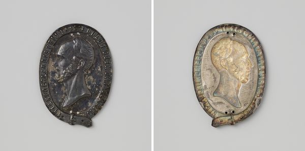 This petite portrait of Wilhelmina van Pruisen, prinses van Oranje-Nassau, is an anonymous creation rendered in gold. The piece captivates with its miniature scale and intricate detailing. A profile bust is framed by a delicate border of small spheres. What strikes me most is the tension between the flatness of the relief and the illusion of depth created by the modeling of Wilhelmina's features and elaborate hairstyle. The use of gold as a medium speaks to the subject's elevated social standing, a marker of wealth and power. The oval form, contained by the frame, creates a sense of containment and idealization, typical of portraiture during this era. This formal structure reflects the hierarchical values of the time, where even personal identity was often framed within social and political contexts. The piece is not merely a likeness, but a carefully constructed representation of status and authority.