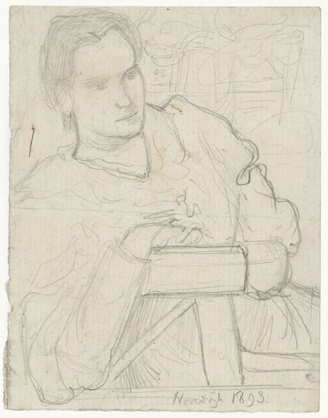Curator: Here we have "Orgelspelende vrouw," or "Woman Playing the Organ," a pen and ink drawing on toned paper attributed to Leonaert Bramer, likely dating from the mid-17th century. It's currently held here at the Rijksmuseum. Editor: My initial feeling is that this is incredibly intimate. Like a quick peek into someone's personal sketchbook. The muted tones and delicate lines really draw you into the quiet focus of the woman. Curator: Yes, there’s definitely a sense of immediacy. Bramer was known for his genre scenes and his detailed studies, and you can see how this work blends those interests. Considering the materials—the relatively inexpensive paper and the easily accessible ink and pen—it makes me think about artistic labor at that time. What did it mean to sketch and capture fleeting moments? Editor: I wonder about the tonal quality of that paper, especially since it appears "toned," meaning it was treated and thus produced and traded by an artisan of the day, who must have specialized in artist's media... Who was he, and how did that support a drawing like this? How might the final selling price reflect his labor versus that of the artist? Curator: That's a really interesting point, how the various layers of labour, from papermaking to distribution to application, are actually present within the very object before us. I also sense a playfulness here; it has all the hallmarks of a doodle, as the light pencilwork does suggest something quirky. Editor: I’m interested in how the materials also limit and enable artistic vision. Toned paper, ink, and pen provide a ready surface for quick, expressive lines, but Bramer clearly made deliberate choices about composition and light. Look at how he suggests volume through varied line thickness; it’s economical and skillful, so even this playful work feels complete. Curator: You're right to consider that tension between the free sketch and conscious technique, but I feel the energy of Baroque dynamism. She's caught in the act of making music. And she could even be at the dawn of music composition, or is even improvising! I think it is safe to assume a woman musician playing with newfound liberties. Editor: Exactly. Seeing her immersed, crafting both sound and space in real-time—and thinking of this sketch’s dependence on the networks of paper, pigment, and skilled labor supporting it. It shifts how I think about what's happening in those swift, dark marks and shading that imply it, somehow. Curator: A wonderfully layered experience of music making. I am really now left with such rich implications around her, and this deceptively modest sketch. Editor: Indeed.