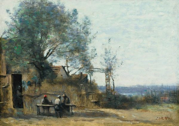Curator: This is Oswald Achenbach's painting titled "Scene at dusk on the terrace of Villa Grazioli in Grottaferrata," executed in oil paint and representative of the plein-air style. The exact date of its creation remains unknown, sadly. Editor: It’s evocative. I'm immediately struck by the dusty earth tones dominating the foreground. It speaks to the physical landscape as a site of production, especially in the contrast to the more romantic cityscape in the distance. Curator: That dusty foreground definitely draws attention to the everyday, doesn't it? But, in this painting, don't you also sense a conscious effort to elevate the figures? There is this wonderful gathering in local attire, a romantic element for sure. Editor: Absolutely. It's interesting to consider the economic implications here – who had the leisure time and resources to gather like that on the villa's terrace, to acquire or produce those clothes? Curator: The materials of daily life in art really make one consider those issues! And notice the figures on horseback near the tree-line; equestrians often appear in visual narratives to imply nobility. In contrast, in the foreground is the hard-packed dirt, signifying common ground, but even the architecture looming from the left evokes stability and social hierarchy. Editor: It really forces us to acknowledge the socio-economic factors that shape the environment and those participating within it. Consider the means of production used to extract the pigment itself from the earth— where was this work produced, by whom, and how did the economics impact distribution? Curator: True. Perhaps in Achenbach's subtle balancing of those components, there's a deeper suggestion about the changing social landscape as older orders met shifting realities. There's almost a melancholy as evening descends… Editor: A commentary woven in the texture and hues, the artist reflecting his contemporary era's social-political tensions within seemingly picturesque scenes of Italian life. I feel both admiration and questions as I consider the human resources required to build it and sustain life in such luxury. Curator: This image serves to reflect not just a lovely vista, but the structures and systems within which people lived. Editor: Definitely more to this beautiful scene than meets the eye.