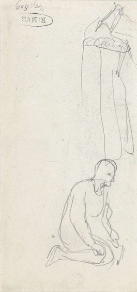 Editor: Jean-Louis Forain’s pencil drawing, "Hiding the ‘louis’,” likely created sometime between 1914 and 1919, presents two figures sketched with rapid lines. There’s a real sense of tension and maybe even some urgency in the scene. What strikes you most about this drawing? Curator: That sketchiness, you see? It’s raw, almost like catching a fleeting moment, a secret whispered in charcoal. This was wartime France, a country caught between hope and despair, painting and drawing as always, with the urgency to document their human spirit. Now, why do you think Forain focused on these two figures specifically, poised as they are? Editor: I wonder if it has something to do with the title, "Hiding the 'louis.'" Maybe they’re concealing something illegal or shameful? The slumped posture of the one figure makes me think so. Curator: Exactly! 'Louis' most likely references the 'Louis d’or,' a gold coin. During wartime, you had profiteering and anxieties everywhere. This wasn’t the grand spectacle of heroism you'd expect but intimate anxiety about survival, perhaps something shady. Have you ever felt that weight of responsibility and the secrecy it demands, especially when resources are scarce? It makes me think, even with so few lines, how well Forain manages to tell such a compelling story! Editor: I think I get it. It’s not just a simple drawing; it’s a glimpse into a very specific and anxious historical moment, where even a simple act of hiding money could carry so much weight and consequence. Thank you. Curator: The pleasure is all mine, young Padawan. Now, go forth, look deeper, and find the untold stories hiding in every line!