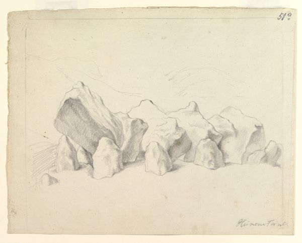 Curator: We're looking at a work titled "Study of Rocks", a drawing rendered in graphite. It's part of the Städel Museum's collection. Editor: Right away, it feels unfinished, like a fleeting observation. Those light strokes, the stark paper – there’s a vulnerable quality to its simplicity. I almost hear the scratching of graphite. Curator: The artist seems very interested in the intrinsic qualities of forms; how the lines and facets of the rock give it a visual weight and symbolic importance that mirrors the actual importance of geographical forms. Editor: The geological "memory" locked within those rocks is powerful. It’s almost like the artist captured more than just their surface—they’ve hinted at eons. There’s a stoicism embedded here too. Curator: Absolutely, mountains are symbols of endurance in folklore. It seems also the artist sought an emotional response, a deep contemplation on nature's majesty, but rendered through simple graphite marks and raw composition. Editor: Makes me think about our impulse to document the seemingly monumental. It almost humanizes the unyielding – turning stone into something soft, fleeting like a thought. Curator: A "humanized" form certainly speaks of an allegorical continuity. Through the artist's rendition, it gains meaning for subsequent viewers, accumulating an aura as we interpret these mountains as archetypes of something beyond our everyday experience. Editor: I can definitely see that—art transforms, memory shapes… These "rocks" might now represent much more: resilience, history, maybe even us. I love when something so elemental spurs on such rich reflection! Curator: Well, it goes to show that, even in its unfinished nature, such studies bear emotional importance and insight, don't they? They capture not just rocks, but a certain enduring human experience.