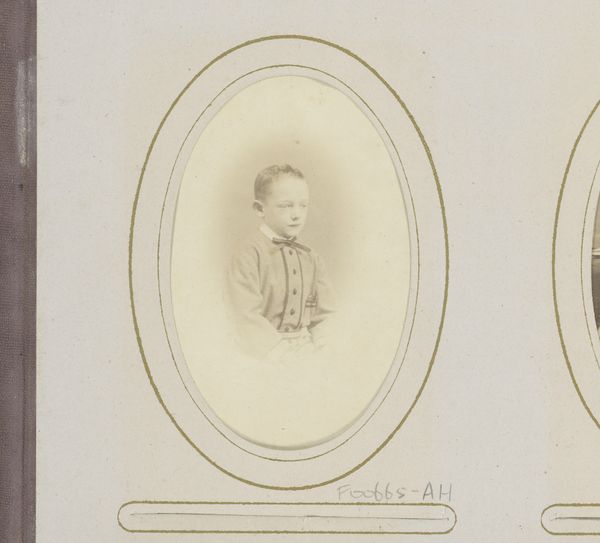 Curator: This albumen print, "Portret van een meisje met pop," probably taken somewhere between 1865 and 1895 by Thomas Martin Staas, is really quite striking. The girl’s formal pose contrasts rather sharply with her youthful attributes, which gives a touching, vulnerable quality. What's your impression? Editor: Aww, there's an undeniable sadness to it, right? The sepia tones just amplify the feeling that you’re looking back at something long gone, maybe even something never fully realized. It is like, a tiny, perfectly formed melancholy encapsulated in a little frame. Curator: Yes, melancholy, that's a great way to put it. And consider the social context: photography was becoming more accessible, but it was still an event. Formal portraits were a way for families to mark time and display social standing. Here, we have this child carefully positioned, clinging to her doll, likely for comfort but maybe also to showcase belonging and status. Editor: The chair she is holding on to… It is almost as ornate as she is prim. What a prop! She must be absolutely roasting under all those layers of heavy garments and is desperate for it all to be over. I see such reluctant submission in her expression. But there is such a starkness about the photo – like the setting, lighting. So bare. Is that typical? Curator: Absolutely. The formal constraints of the era heavily influenced the photographic style. Studios carefully controlled the lighting to achieve a certain clarity and detail, showcasing clothing and accessories. Remember that posing also required long exposure times which further lends itself to these frozen gestures and restrained emotions. Editor: Thinking of that exposure time… the poor kid having to stand still, no wonder she looks mournful! Perhaps Staas tried to capture her spirit? To inject life into the frozen format of studio portraiture? Does that work in the modern day I wonder… or are we doomed to always view historical portraits through our modern gaze and interpret that ‘sternness’ and ‘restraint’ with the lens of melancholy. Curator: That's a profound question. Maybe it’s in the dialogue itself, our differing perceptions bouncing off each other that give us more than one perspective. Her future or a picture of how things were is open for interpretation by many eyes and voices. Editor: Indeed, so whether capturing an accurate historical document or something sad forever immortalized and interpreted is… Well, it is still gorgeous.