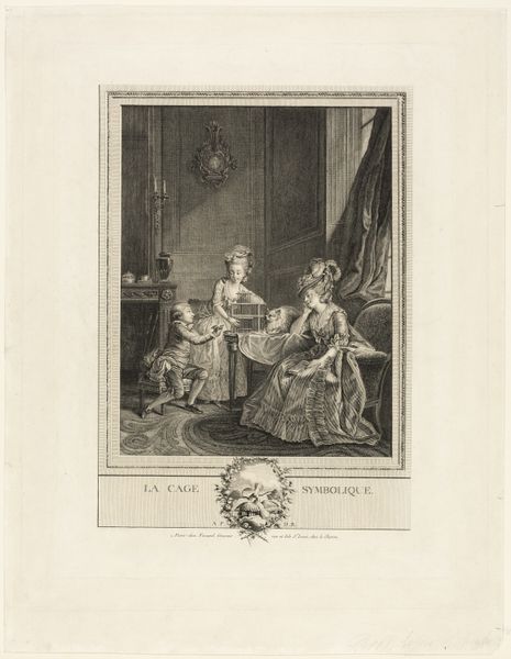 Curator: This engraving from 1765 by François Hubert, titled "Interieur met een lezende vrouw, bezocht door Amor," presents a tableau vivant of Rococo elegance. What strikes you first? Editor: The starkness, paradoxically. It's an engraving, of course, but the sheer volume of precise lines somehow strips away a lot of potential depth, leaving it feeling rather two-dimensional, a bit flattened, despite the implied textures. Curator: Interesting. The meticulous linework is essential. The image functions through contrasting patterns, the flowing lines of the woman’s robe against the rigorous architecture, and the subtle tonal variations crafted solely with lines to evoke shadow and light. This allows the composition to focus on the central narrative contrast. Editor: And that narrative, delivered, of course, through material clues: notice the quality of the paper itself. Its texture speaks to the intended audience—wealthy enough to commission and collect engravings like this, a direct insight into class and labor during the Rococo. We also see the process of making this piece reflected in the details of the clothing and interiors; the details show a certain affluence tied to materials such as silk and ornamentation within domestic space. Curator: Indeed. Consider how the cupid, with his impish grin, contrasts against the studied composure of the woman reading. It represents the disruptive potential of love intruding upon intellectual pursuits. Observe her garments: they imply both status and a certain constraint. These formal elements contribute to the print's delicate equilibrium, its suggestion of narrative without fully disclosing it. Editor: But think too of how such scenes romanticize the act of reading for women. Here we have, ostensibly, leisure and the freedom to study, but that freedom is inherently restricted, existing only through the material and social structures that support it—the very structures visualized here through fine paper, lavish robes, and ornate rooms. The scene presents a dream more than a reality. Curator: Perhaps so. Through a concentrated visual language, it creates a world governed by the push and pull between order and desire. Editor: Ultimately, it is an expertly crafted image; its value emerges precisely from that meticulous detail, that refined labor. But we must ask: labor for whom? What realities are omitted within the beautiful image? Curator: A stimulating divergence, prompting contemplation on art's construction, meaning, and reach. Thank you.