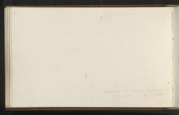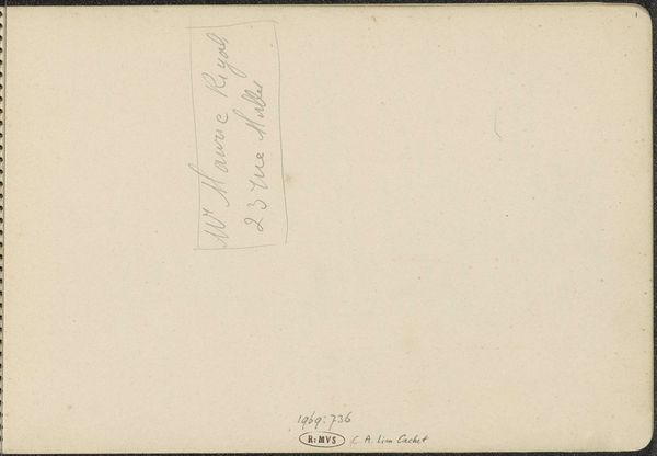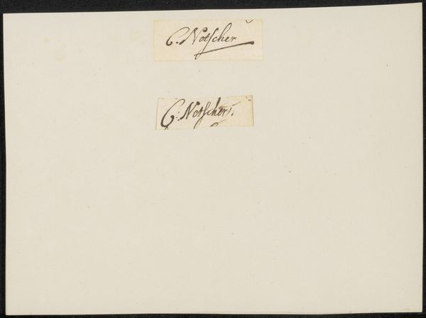 Editor: We're looking at "Handtekening van Lambert Mathieu," which roughly translates to Signature of Lambert Mathieu. It's dated 1814 to 1861 and created with ink on paper. My first impression is one of sparseness and isolation, a single gesture suspended in a field of white. What strikes you when you observe this piece? Curator: Immediately, I am drawn to the formal relationship between the curvilinear script and the rectangular field it occupies. The signature itself, isolated, takes on the characteristics of an abstract line drawing. Notice how the artist has situated the name on another, even smaller rectangular, creating an effect of a shape within a shape. It forces us to question what is being presented to the viewer. Is the signature part of the artwork or merely a feature? Editor: That’s interesting. It also looks as though a piece of paper has been glued or layered onto the background? Do you see it that way too? What does the artist's placement signify? Curator: Precisely! The layering introduces depth, subtly disrupting the flatness of the paper. The placement creates an intriguing tension. The signature isn't centered but drifts towards the upper register. Consider how the contrast between the dark ink and the pristine paper serves to accentuate the intentionality behind each stroke, elevating the gesture from simple identification to a statement of self. It has a painterly quality in spite of it being just a signature. Editor: So, the very act of signing becomes the art itself through these structural relationships. Curator: Precisely. It demands a close reading of line, form, and negative space. The way that all elements create both tension and visual interest. It is both self-referential and invites the viewer to a personal investigation. Editor: That's a totally new way of considering something as commonplace as a signature. Thank you! Curator: Indeed! Exploring its construction helps us understand intention. Thank you!