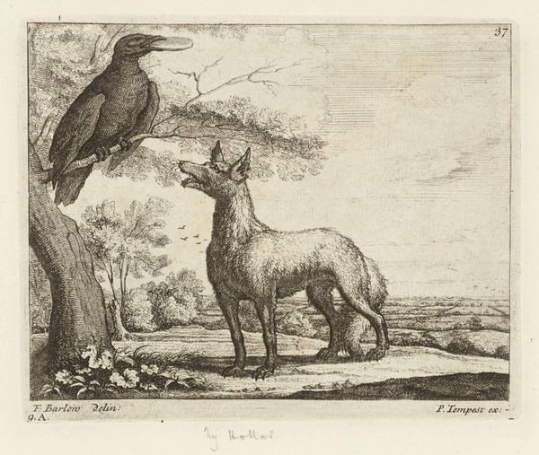 Curator: Here we have "Two Birds: a Bird of Paradise and an Amboina Ibis", a print made by Jan Goeree between 1680 and 1731. It’s a rather striking composition. Editor: Indeed! My first impression is how it evokes a slightly melancholic, almost surreal atmosphere. The meticulous details contrast oddly with the fantastic landscape backdrop, giving it a dreamlike quality. Curator: The dreamlike quality likely stems from its origins within the context of early scientific illustration, and the desire to classify and understand exotic species encountered during colonial expansion. Birds like these became symbols of newfound territories, displayed almost as trophies of exploration. Editor: You know, seeing the Ibis depicted with these bizarre contraptions hanging from its beak… they strike me as odd instruments of restraint. Symbolically, does this suggest a curbing of natural freedom, a control of the exotic world? Curator: It is important to remember the social hierarchies inherent at this time. The 'Amboina Ibis', an imposing, standing figure in this picture plane, would have stood in direct contrast with the 'Bird of Paradise', perched higher, but implicitly denoting class difference within the global structures of power. Editor: I see that in the hierarchy implied in this avian portrait. It echoes how artists portrayed the divine right of kings, the higher estate given dominion above others. Perhaps here we are asked to consider our right to observe nature itself? Curator: It definitely invites consideration on that question, placing on center stage the conflict between the allure of exotic species, and the implied control of those animals for display and societal prestige, both intertwined with the visual power held through print culture. Editor: Absolutely. These images solidified not only knowledge but also ownership of the natural world. That resonates even now. Curator: Agreed. Considering that is why looking at pieces like this is so relevant today. Editor: A curious reminder of the world through the lens of ambition and acquisition.