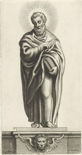 Editor: Here we have "Heilige Matthias," made sometime between 1639 and 1670 by Petrus Clouwet. It’s an engraving, giving it this interesting, almost mass-produced feel, despite the subject. I’m curious, what strikes you about the materiality and the creation of this print? Curator: I'm drawn to the explicit labour here, revealed through the engraving. Consider the time invested in producing multiple impressions versus, say, a unique painted canvas. The lines themselves denote a system of production—the very means of making dictates the art. What implications might the ability to reproduce images have for the consumption and dissemination of religious figures like Saint Matthias at this time? Editor: So, it’s not just about the image itself, but the accessibility that this particular medium provided. Does that influence how people might have viewed religious figures, seeing them replicated and distributed? Curator: Precisely. It democratizes access to religious imagery, impacting its perceived value. Think about the market for these prints: Who were the consumers, and how did their patronage influence the artist's output and the subject matter itself? We're not simply admiring a depiction of Saint Matthias; we're also considering the economics of faith in the Baroque period, materialized through this very print. How does knowing this change your initial view of the artwork? Editor: I think it definitely pushes me to look beyond just the aesthetic. The repetitive nature of printmaking seems at odds with the almost sacredness of the subject, but I can see that contradiction as part of its meaning. It gives the object an economic weight as well. Curator: It underscores that art is always produced under specific conditions and never exists in a vacuum.