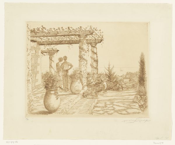 Simon Moulijn made this garden scene, Tuin met pergola, with what looks like ink on paper. The composition is constructed from a series of hatched marks, layered to build up tone and shadow. Look at the way the dark marks on the left contrast with the lighter shaded walkway, the drawing is full of this type of contrast. The physical presence of the ink is ever present, the eye is always drawn back to the material of the piece. The columns of the pergola are constructed from thousands of tiny vertical marks which create a feeling of solidity and depth, the artist uses the physicality of the medium to create a convincing illusion of reality. It reminds me of some drawings by Van Gogh, where mark making becomes a language in itself, and the work embraces the many possible interpretations and ambiguities of art.