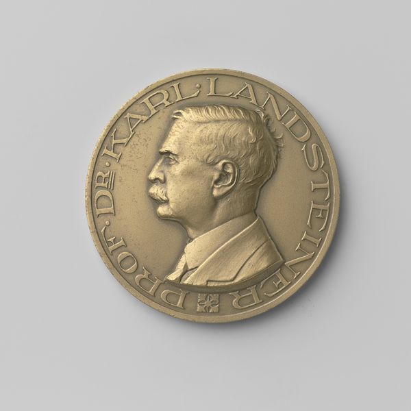 Curator: Here we have a bronze relief, "Overlijden van Dr. Willem Drees," or "The Death of Dr. Willem Drees," created in 1988. The piece currently resides in the collection of the Rijksmuseum. Editor: My initial reaction is somber respect. The texture of the bronze seems to age the subject even further. It possesses a rather stark quality for commemorative portraiture. Curator: Indeed, the texture is striking. Observe how the artist uses varied depths and intricate lines to define Dr. Drees's features. There’s a strong interplay of light and shadow that gives the portrait considerable dimensionality despite being a relief. The circular composition traps you within its contours and guides your eyes along its edges. Editor: I’m struck by how this rendering potentially romanticizes Dr. Drees' legacy, as the former Prime Minister. Though considered modest in life, here, the lines etched around the eyes seem less about aging and more like records of steadfast dedication, an unyielding public servant—but perhaps that's overly generous of this depiction. I question to what extent realism is at play versus memorializing a social narrative around an esteemed political figure? Curator: An intriguing point. Focusing solely on its form, there is the classical influence evident in the clean lines and dignified pose, juxtaposed with elements of realism—see the detail in the skin, the lines in his forehead. This melding of styles contributes to the artwork’s sense of gravity and enduring quality. Semiotically, the gaze itself commands respect and hints at a figure deeply thoughtful and contemplative, drawing on both modern and archaic concepts to establish the sitter’s presence. Editor: Right, the gaze and circular form give me pause. Was it chosen to denote unity, wholeness, a never-ending cycle of legacy—as many official memorial images intend? Given Drees's social democratic inclinations, what political statement does its style and commemorative context try to impart about post-war Dutch politics? Curator: Well, looking at this relief from a formal perspective reveals how it uses texture and composition to establish an emotional connection. I read his gaze differently—perhaps weary. Either way, it showcases masterful sculptural construction and understanding of materiality. Editor: And I appreciate that this piece enables a conversation of political memory, as it can solidify or undermine social constructs based on an official portrayal. Food for thought about politics, aesthetics, and posterity.