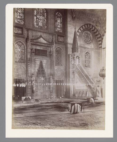 Curator: This is an albumen print dating to 1894. The photo, titled “Minbar van de Grote Moskee van Bursa” is credited to Sébah & Joaillier. What leaps out at you first? Editor: The precision—it's a record of intricate woodwork. You can practically feel the density of labour behind that minbar, all that hand-carving. Curator: Absolutely. And this photograph captures it with incredible clarity. It offers, I think, a Western audience’s glimpse into a very specific moment of devotion and artisanship. It speaks of power, not just religious power, but of skill passed down. Editor: Yes, and to me, it reveals a fascinating exchange: European photographers documenting Islamic artistry for consumption, exoticizing labor in a way that erases its inherent value and craftsmanship. Curator: A valid point. We do have this Orientalist gaze in play here. However, to play devil’s advocate, doesn't photography offer a broader accessibility, even if framed within that gaze? Doesn't the craft, the pure making of it, transcend that? I wonder if the photographers here were more impressed by the sheer artisanal excellence. Editor: Perhaps. I see a complex system of visual exploitation. The value of a unique, hand-crafted pulpit converted to commodities to view, collect, consume…it strips it of cultural worth. Curator: I get that. But also the reverse could be true too—the work still survives now, to be known, to be appreciated, however problematically. It speaks through its time to now, and possibly also will do for years to come. That fact in itself has value, though tinged with complexity. Editor: It is complex, and important for us to look through both lenses, and to realize we're looking not just at art, but a kind of production with many sides to it. Curator: Indeed. A record both beautiful and troubling, then, asking perhaps more questions than it can definitively answer.