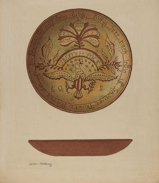 Editor: We're looking at Edward Jewett's "Warming Pan," made between 1935 and 1942. It's a watercolor and drawing, and it almost has this blueprint quality, like an antique technical illustration. What stands out to you about this, historically? Curator: Immediately, the very *idea* of a "warming pan" speaks volumes. It hints at a specific historical context – think pre-central heating, where such a tool was essential, particularly for the vulnerable. Who would have owned such an item, and what does its existence reveal about class structures and domestic labor at the time? Editor: So it's a clue to living conditions... Curator: Precisely. And notice the meticulous detail Jewett captures using watercolor, this hints at the values placed on craftsmanship, but perhaps also something about artistic production under the WPA federal art programs during the Great Depression. Might this rendering be a way to preserve the memory of objects from a vanishing past, or simply to provide work for artists? How does this artwork relate to notions of value, utility, and memory, particularly in the context of the 1930s and 40s? Editor: That’s a whole new way to look at a humble object! It sounds like even something as simple as a warming pan can open up a lot of questions. Curator: Exactly! Examining an artwork means asking who, why, and for whom was it created. Ultimately, what does it tell us about society? Editor: It gives new appreciation to an otherwise overlooked part of the past. Thank you!