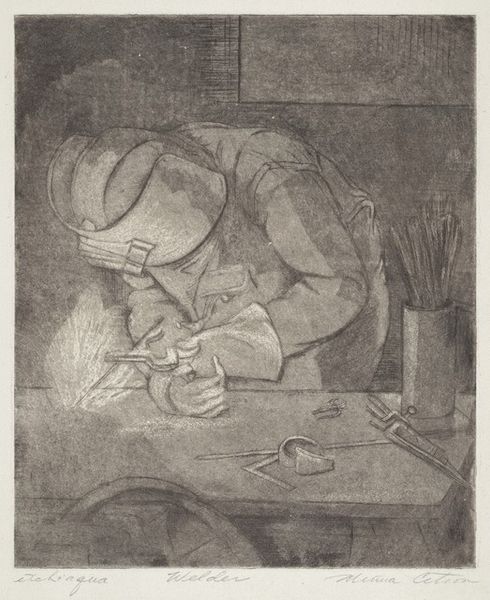 Minna Citron’s ‘Welder’ from 1940, is a lithograph on paper, and it’s all about line, tone and texture – the way they build into a kind of sympathetic portrait. Look how the strokes of gray build up the figure of the welder, bent over their work. There's a real care in how she renders the sparks flying off the welding torch. It feels like Citron wants to show us the labour, the concentration, but also maybe something beautiful in this industrial scene. The welder's mask obscures their face, but the hands, roughened and focused, tell their own story. And all around, the textures of the factory setting – pipes, tools, metal – are built up with these lovely, almost loving, marks. I’m reminded of work by Elizabeth Olds, who was also making social realist prints at this time, particularly her willingness to engage with industry, not as something to be feared, but something that shapes all of our lives. Art is never made in a vacuum, right? It’s always part of a bigger conversation, and this print is no exception.