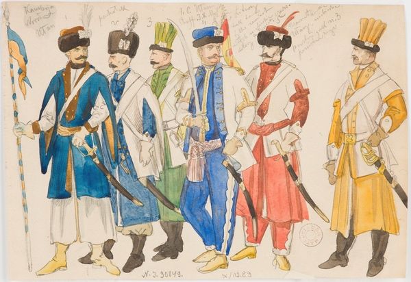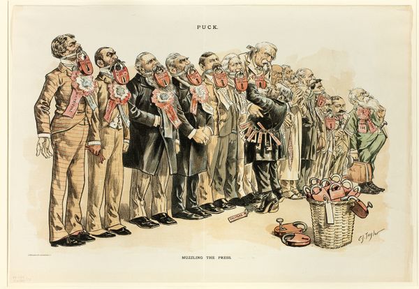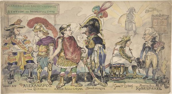Editor: So, here we have Jack Davis’ "Cracked #14 Cover" from 1960, done in mixed media. What strikes me is how these caricature figures seem to march through different eras of military history... but with a very satirical edge. What do you see in this piece? Curator: I see a potent critique of the normalization of violence and the ways in which societies glorify and perpetuate cycles of conflict. Davis, by reducing these figures to caricatures, encourages us to question the romanticized notions of war that are so often presented to us. Who benefits from those notions? Editor: That makes sense. The exaggerated features certainly undermine any sense of heroism. What about the range of uniforms? Are they meant to suggest something about American identity? Curator: Precisely! Consider how each uniform represents a specific period, from the Revolutionary War to perhaps a more contemporary, post-war labor force presence. Davis is not merely presenting a historical timeline, but interrogating how militarism shapes our collective identity and perpetuates power structures, especially those exploiting class. Who gets left behind? Editor: I hadn't thought of it that way. The way they're all kind of grinning now feels almost complicit. Like they're in on some joke at our expense. Curator: And consider Cracked magazine itself. It offered an alternative to the more sanitized and conformist narratives prevalent in mainstream comics, so Davis is complicitly challenging these entrenched norms. What are other avenues of disrupting the canon? Editor: It is disturbing how familiar their smiles seem... I definitely see this artwork differently now, it is quite unsettling! Curator: Indeed, Davis’ work, beyond its humor, forces us to confront uncomfortable truths about the glorification of war and the narratives that serve to normalize violence. There is more going on beyond the humourous surface!