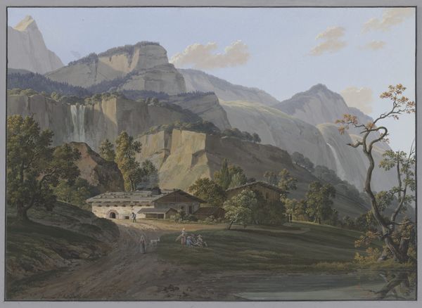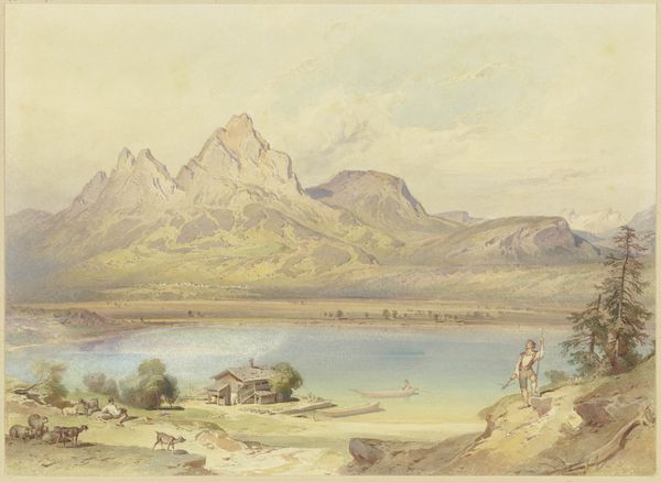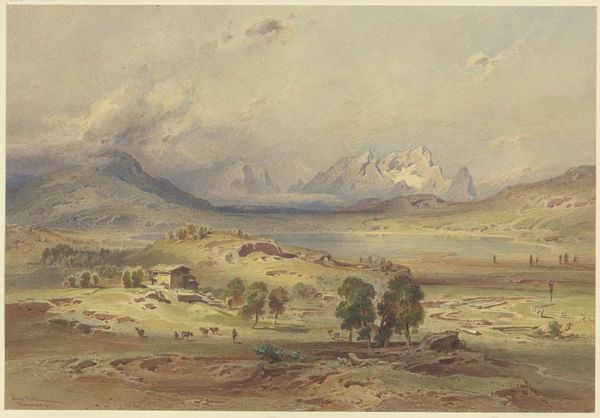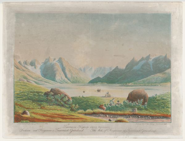 Editor: So, this is "The Rocky Mountains, Lander's Peak" created in 1866, it appears to be a print with watercolor, tempera, and etching by James Smillie after the original oil painting by Albert Bierstadt, and housed here at the Met. The vastness is quite striking. What underlying commentary do you think this imagery suggests? Curator: That vastness, I think, is precisely where the power and the problematic nature of this work resides. The Hudson River School, of which Bierstadt was a key figure, was deeply intertwined with the concept of Manifest Destiny. How do you see that playing out here? Editor: Well, you've got the grandeur of the American West idealized through dramatic landscape, but that visual dominance seems to negate the presence and perspective of Indigenous communities also depicted within the scene. Curator: Exactly! The encampment is almost picturesque, easily digestible for an Eastern audience. This image served as a form of visual propaganda. What impact do you think that had, showing a seemingly "peaceful" co-existence in an already romanticized depiction? Editor: I hadn't considered the way that idealization essentially masked the violence and displacement happening in reality. It's a dangerous visual narrative. So how can we approach appreciating the artistic skill, while critically engaging with its problematic implications? Curator: By acknowledging that art doesn't exist in a vacuum. We must always interrogate the power structures at play in both its creation and reception. Even its visual strategies speak volumes. What are the most prominent details or points of focus for you? Editor: Probably the meeting of this untouched frontier and the quiet inclusion of Native Americans - it's pretty misleading. I had initially perceived it as a pretty landscape, nothing more! Curator: And that initial reaction is valid, but critical engagement demands we delve deeper into the complex interplay of aesthetics, history, and politics. This is how we start thinking about art as a mirror, reflecting back both beauty and the difficult truths of our society. Editor: Thanks, seeing it with fresh eyes makes all the difference. Curator: The pleasure is mine; hopefully others viewing it now will begin to have a sense of that larger story too.