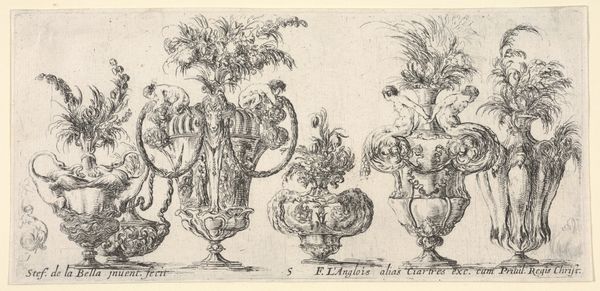 Curator: Look at this bizarre feast of creatures! Giovanni Domenico Tiepolo, working around 1751-1755, created this study titled, “Studies van sfinxen en vissen en hoofden van saters en Flora"—which translates to “Studies of sphinxes and fishes and heads of satyrs and Flora." Editor: It's delightfully unsettling! The contrast between the stoic sphinxes and the... frankly, deceased fish creates such a strange mood. Almost like a philosophical still life. Curator: Philosophical is spot on. Tiepolo really packs the composition, doesn’t he? I find myself pondering the nature of the allegories presented. It's like peeking into his imagination's bizarre storage room. Editor: Allegory, indeed! Fish signify fertility or chaos depending on your reading. Here, amidst heads of satyrs—those symbols of masculine wilderness, id, excess—they’re laid out, submissive, becoming decorative motifs rather than symbols of virility or danger. What’s THAT about? Curator: It's wild, isn't it? Those precise, baroque lines and detailing render them all so meticulously. The contrast between the sharp definition of the fish and the more loosely defined satyrs… I feel like it could reveal his creative process as a study. Or he might have enjoyed making it weird and evocative. Editor: Maybe the 'Flora' head, garlanded in leaves, stands in stark contrast to these defunct, animalistic and patriarchal totems. Flora suggests renewal, hope. Does it critique power, the 'end' state of unchecked power or masculine domains that have not fostered fertility, growth, and shared community? Curator: Interesting perspective! I am thinking of the time and the baroque era - this style loved this type of thing! Still life but made strange. I wonder about Tiepolo - how deliberate was he? It could also be that the contrast generates dynamism and that is that... It feels like these archetypes and creatures that populate art are having a picnic together! Editor: I love that "picnic" metaphor! Tiepolo’s collection feels potent as a gathering, and the contrast of the sphinx with its traditionally masculine posture against this table-turned-mausoleum is quite brilliant, subversive, and a potent memento mori for the elite class in its epoch. Curator: A delightful end for our short tour. Tiepolo offers us not just skilled drawings but a strangely timeless puzzle. Editor: Yes! A puzzle that perhaps challenges us to not take anything - least of all ourselves or what we believe about the world - too seriously.
