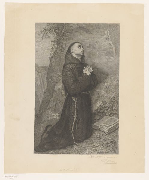 Editor: Here we have Auguste Danse's engraving from 1862, titled "Praying Francis of Assisi with an open bible and crucifix." It's striking how still and reverent it feels, like a captured moment of intense devotion. What captures your attention when you look at it? Curator: The light, or rather the way Danse plays with shadow, it almost feels like St. Francis is emerging from a spiritual realm, doesn't it? And then you notice the almost photorealistic details in the rock and the book. Makes me wonder, was Danse grappling with the emergence of photography, trying to prove engraving could capture both realism and inner experience? Do you think that might be the case? Editor: It’s interesting you point that out, I was thinking more in terms of Romanticism, in the sense that it captures raw emotion in the figure, who is otherwise positioned in very realistic fashion? What about you? Curator: Absolutely. And Romanticism, particularly its fascination with spiritual intensity. You see that play out in his posture - head thrown back, eyes fixed on something we can't see, but clearly dictates the movement, that captures how overwhelming spiritual encounters could be represented visually, but is somehow very intimate too. It almost feels like a painting! I think the scale is particularly effective with the light and shading; but I was also very interested by the positioning and setting of the image. Where did you find it? Editor: I found it on the Rijksmuseum’s online database! It surprised me with its simplicity – in monochrome! Thank you for guiding me. I see a lot that I missed originally. Curator: And I hadn’t thought so explicitly about how the choice of monochrome helps concentrate the eye on form and emotion. Wonderful, isn’t it, how a conversation can open up new vistas even on a well-trod path.