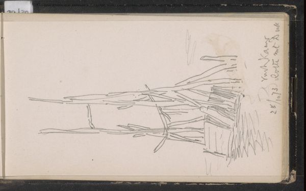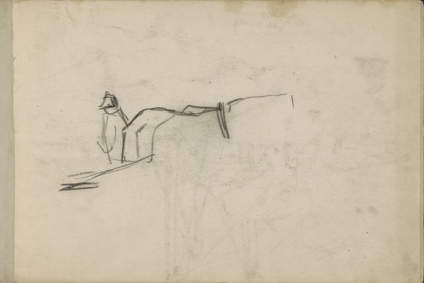 Curator: This is George Hendrik Breitner's "Staande man en een mannenhoofd," created sometime between 1898 and 1914. It's a drawing, using pencil on paper, and currently held here at the Rijksmuseum. Editor: There's an immediate raw quality about this sketch that appeals. The energy of the lines creates a feeling of immediacy and incompleteness. I wonder what the story of that prone figure is. Curator: I’m struck by how Breitner captures the essence of his subject with such minimal means. Note the strategic use of line weight. How the broader strokes define the contour of the standing figure's torso and the man's head, providing structure to the composition. Editor: And those softer, almost smudged lines surrounding them speak to a working process. What kind of paper do you think Breitner used, and did he have a specific function for this study within a larger project? I wonder if he did other portraits using the same paper stock. Curator: Those are excellent questions about the materiality, since his focus seems drawn to the structure itself, revealing a keen observation translated through simple, direct lines. I would add the way the standing figure is rendered full-length—yet so quickly, while the other face hovers with its implied presence below, almost spectral. It produces this tension in the formal relationships. Editor: It’s intriguing, that placement, that it hints at both movement and stasis. Did Breitner often use preliminary sketches like this to plan out more finished works? Understanding the workflow provides valuable context. What was his practice? What kind of pencils did he use and did he prefer working in natural or artificial light? Curator: I appreciate you directing our focus on the processes embedded here. Perhaps this emphasis on production provides the framework within which we, as viewers, may also produce meaning. But in the end, it's how the composition guides the viewer's eye—around, then back to linger. That’s the drawing's most vital power. Editor: Agreed. This exercise really draws attention to the often-invisible labor behind image making. An important and interesting image.