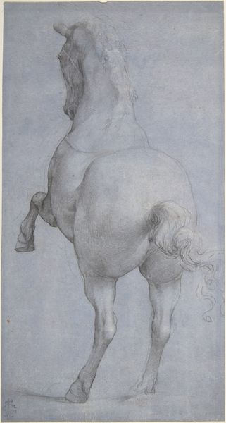 Curator: Well, I am immediately struck by the raw energy, like a contained storm! The Pegasus seems restless, muscles coiled, ready to bolt off the paper. It's a very grounded image, even though we know Pegasus is the most winged of beings. Editor: Here we have "Pegasus" an engraving by Jacopo de' Barbari, dating from the early 16th century. Look closely, and you will find de' Barbari also added his signature symbol of the caduceus, which suggests at the same time healing, commerce, and diplomacy. The themes of form, figuration and mythology meet at the heart of Renaissance exploration. Curator: Hmm, so you are picking up on the more civic virtues? For me, that caduceus is much smaller than Pegasus, almost as though to admit defeat: there are limits to all those civilising dreams. And how often have humans tried to catch, bridle or even eat that divine horse. Look at those tense hindquarters! This engraving reads, in some ways, as a tragic struggle to fly. Editor: But doesn't that also express the core Renaissance ambition to blend classical wisdom with earthly knowledge, almost a yearning to reconcile the real and ideal? Pegasus, who sprang from Medusa’s blood when Perseus severed her head, embodies divine inspiration—in that, it makes complete sense that Jacopo wants Pegasus to signify an era committed to artistic, intellectual, and spiritual rebirth. Even those wings – too small and strangely feathered for their mythic form. What's that about? Curator: Exactly, I think those "small and strangely feathered" wings ARE the whole point! The sheer strain is visible and he could simply take off! Think about it like this: what if, Pegasus remains here of his own will. It isn't constrained—merely held to the real? Editor: I am hearing something slightly melancholic, I think! Perhaps a sign to artists? A reminder that the source of inspiration can be powerful, wild, and even a little bit dangerous? Curator: It would fit for de' Barbari’s period... a world moving away from purely symbolic representation towards a form that accepted flaws and individuality, perhaps. Anyway, it gives me something to think about! Editor: Me too; let’s move on, before we get TOO inspired!