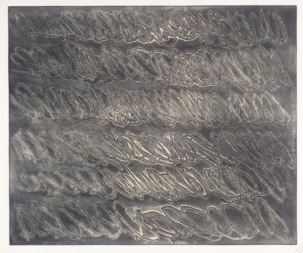 Editor: Here we have Cy Twombly's "Untitled II," from the Tate collection. It's a dark, almost somber work, filled with repetitive looping marks. What's your perspective on this piece? Curator: The key lies in examining Twombly's process. The repeated gestures, almost meditative, highlight the physical act of creation. What does this repetition suggest about labor and the artist’s engagement with materials? Editor: It's like he's blurring the line between high art and a more physical, repetitive task. Something almost anyone could do. Curator: Precisely. It challenges traditional notions of artistic skill, focusing instead on the materiality and performative aspect of mark-making. Editor: I hadn’t considered the labor aspect so directly. Curator: Considering the means of production opens new avenues of interpretation.