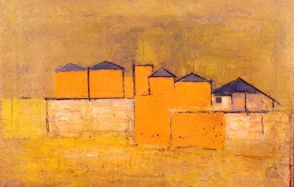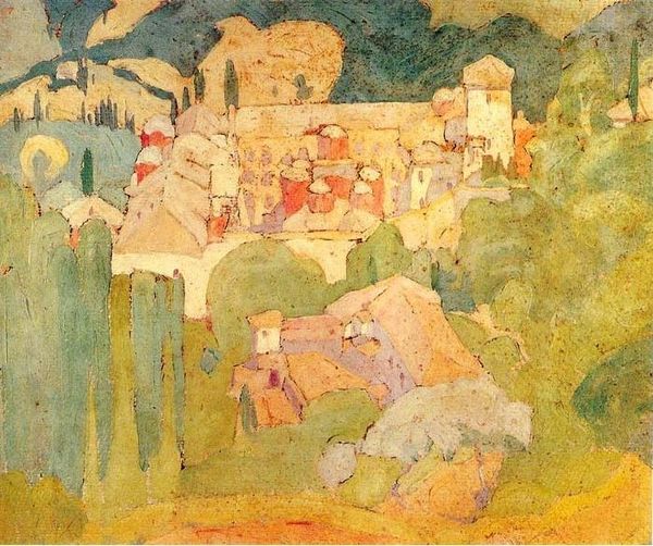 Editor: Wassily Kandinsky's "Walled City in Autumn Landscape," painted in 1902 using tempera, presents such a simplified, almost childlike depiction of a cityscape. It’s really charming. How do you interpret this work? Curator: It’s tempting to view this as naive, but considering the historical context, let’s examine Kandinsky's relationship with the evolving artistic institutions of his time. Do you notice how the landscape seems flattened? The colours, though vibrant, don't create a convincing sense of depth. Editor: Yes, it’s almost like looking at a stage set. Curator: Exactly! This intentional distortion aligns with the burgeoning Expressionist movement's rejection of academic realism. Consider the Secessionist exhibitions of the era and their efforts to defy institutional norms by showing "primitive art" alongside avant-garde pieces. This aesthetic flattening challenges the established traditions that the old academy represents, and makes you wonder, who is deciding what art "should" be? Editor: So it's not just about depicting a place; it's a statement against the art establishment? Curator: Precisely! And think about the social and political anxieties simmering beneath the surface in early 20th-century Europe. Artists began looking inward, turning to abstraction to capture deeper, less tangible truths. The image becomes less about the "walled city" itself and more about expressing something beyond its physical reality, almost utopian. Editor: That makes me see it differently. The deliberate simplification and bold color choices aren't just stylistic; they're a rejection of what art was expected to be. I appreciate Kandinsky’s role in redefining artistic conventions! Curator: It certainly reflects a radical questioning of the art world’s power structures and established visual languages. I think the artwork encapsulates how avant-garde painters sought legitimacy beyond the Parisian art scene in places where new aesthetic conventions could freely emerge and contest art historical expectations.