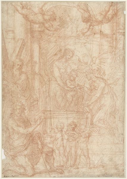 Curator: The drama positively vibrates off the page here. The piece before us, rendered in pen, is titled "The Centurion at the Cross." Giovanni Battista Piazzetta executed it sometime between 1692 and 1754. Editor: It certainly conveys a raw, visceral feel. There's a density to the composition, isn’t there? The layers of hatching create depth but also visual complexity, a kind of frantic energy. Curator: Precisely. Observe how the cross looms large, dominating the upper portion of the work, an inescapable symbol, naturally. Yet Piazzetta doesn’t just present the scene, he refracts it through line. Editor: It's intriguing how the artist employs such visible, almost hurried linework. The centurion, caught in a moment of realization—perhaps recognizing divine power or simply human fallibility. His figure serves as a focal point, and it leads our eyes up to the crucifixion, of course. I wonder what the image meant to its contemporary audience. What meaning did viewers find? Curator: Ah, meaning! Semiotics and the weight of representation is relevant here. Each figure becomes a signifier, laden with religious and historical baggage. The swirling lines almost dissolve the solidity of form, evoking an atmosphere of spiritual awakening and perhaps guilt. The pen, typically a tool of precision, here seems wielded for emotional impact. Editor: Indeed. Look how he uses light, or rather the absence of shading, to guide us. There are certain highlights—the upturned face of a soldier, the implied light from above—they accentuate the emotional turmoil. The formal properties elevate a moment in a historical account. Curator: Without the need of excessive visual theatrics from its historical moment of origin, the very bones of the thing communicate it just as well, in this form. Editor: A striking reminder that even seemingly simple forms can unlock incredibly deep pools of understanding and reaction. Curator: Quite. Thank you for unpacking with me what "The Centurion at the Cross" imparts to us today.