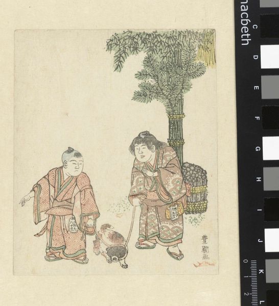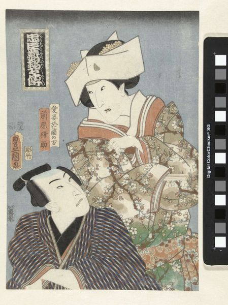 Curator: Standing before us is “Two Actors,” a woodblock print crafted sometime between 1828 and 1830 by Shunkōsai Hokushū. Isn't it a striking glimpse into Edo-period theater? Editor: That's putting it mildly. What a wonderfully bizarre and slightly tragic tableau! The fellow on the left, half-undressed and clearly distressed, with the other guy trying to give him an empty bowl. It feels loaded with emotion. Curator: Absolutely. Hokushū, like many Ukiyo-e artists, captured fleeting moments from everyday life and, importantly, the vibrant world of Kabuki theater. It’s as if he has stopped time, mid-performance, to invite us into their world. Editor: I see so many symbols, perhaps the bowl relates to generosity or sacrifice... It could indicate an ending. Is there maybe even commentary here about fame or the precariousness of an actor's life—a fall from grace visualized through those garments falling away? Curator: It's compelling how you pick up those symbolic echoes. Ukiyo-e prints often played with visual puns and subtle messaging beyond the surface. This print might indeed offer commentary on the actor's social standing or perhaps hints about the specific play they’re performing in. Editor: Right, think about that box to the right of the one actor… It also hints to what those two characters have to act; those Japanese sign are saying Udon in Hiragana writing… Maybe this performance happened during breaktime! I'm captivated by how the patterns on their robes—all these checks—seem to ripple outwards like an emotional wave. Even in their stillness, the artist imbues so much movement. Curator: Hokushū's skill with the woodblock technique—the precision of line, the controlled palette—it’s magnificent! What do you think it evokes for a modern audience here at the Rijksmuseum? Editor: It whispers stories of a world long past but reminds us that drama and human expression remain timeless. This print doesn't just depict actors; it embodies the theater's enduring ability to hold a mirror up to our anxieties, ambitions and vulnerabilities, like what we can see with that simple and powerful print work. Curator: Precisely, and it serves to demonstrate art's incredible ability to transcend both time and space, no? Thank you.