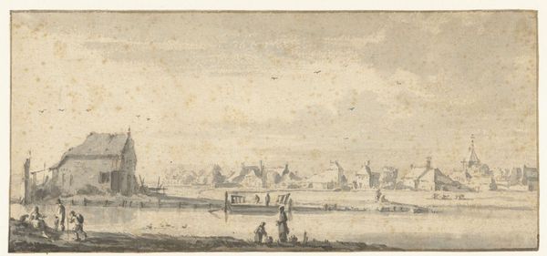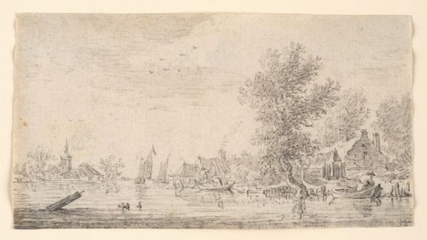 This drawing by Jan van Goyen captures a river scene with fishermen near Leiden, rendered with graphite on paper. The most striking motif is the communal fishing net, a symbol deeply rooted in human history and culture. This net isn't merely a tool; it echoes through time, recalling the 'miraculous draught of fishes' in Christian iconography, a symbol of abundance and divine intervention. The act of pulling together evokes shared effort and reliance on nature, resonating with ancient hunting rituals and the primal bond between humans and their environment. Observe how the fishermen's concentrated labor mirrors the cyclical rhythms of life. The drawing taps into our collective memory, resonating as a powerful reminder of our enduring relationship with nature's provisions. Consider also how the composition itself directs our gaze, inviting us to contemplate the quiet dignity of labor and the enduring human spirit.