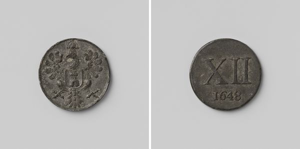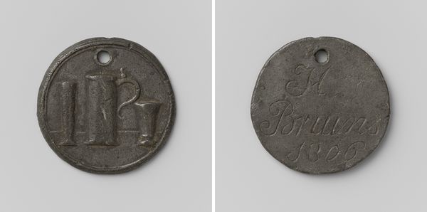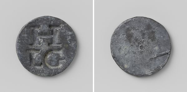 Editor: This is a house coin, or 'Huismunt,' dating from 1818 to 1859, commissioned by the Society of Welfare and currently held at the Rijksmuseum. The rough texture and simple inscription give it a weighty, almost primitive feel. What can we learn by observing its construction and features? Curator: Note the stark contrast between the smooth background and the raised lettering. Observe the form. On one face we see the initials ‘MVW’ stacked atop ‘1/2 C’; whilst the opposing face contains ‘GK’. Consider the incuse lettering; its forceful, clean lines offer a profound sense of order, directly at odds with the medium. Editor: That tension between order and medium is fascinating. The practical function clashes against its potential to carry significant historical meaning. But isn't this emphasis on form separate from what the artwork stands for? Curator: Not at all! One must engage with what one perceives with their own senses. The letters stand in for greater ideas. Ask yourself: What are the possible purposes of the simple inscriptions of a ‘coin’? Is there is an importance to consider within its purely geometric form? Editor: That’s given me a completely fresh way to look at everyday items. I was fixating on its historical background and the social context. Thank you! Curator: It has been a pleasure to consider this coin from an objective view of its internal qualities.