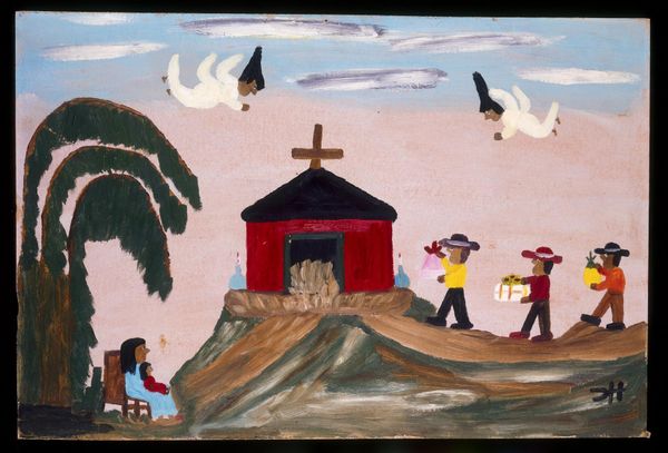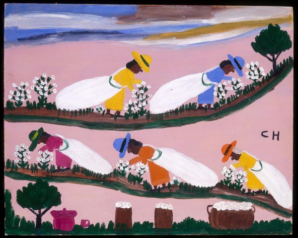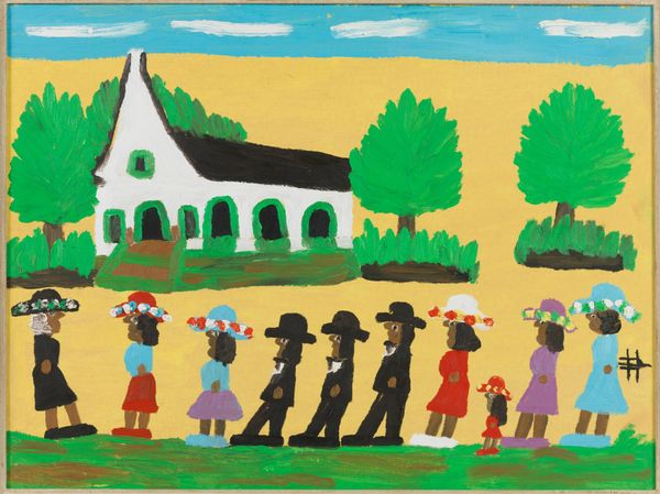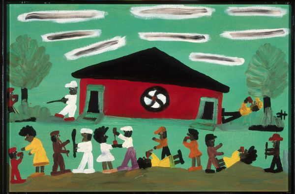 Clementine Hunter’s "Saturday Night" is a scene rendered in oil on canvas, characterized by its bold, flat forms and vibrant colors. The composition immediately strikes you with its naivety; the figures are simplified, almost childlike, arranged across a shallow, compressed space. The painting’s structure is defined by the stark contrast between the red building and the surrounding greenery, while figures partake in what might be seen as revelry. The artist employs color not for realism, but for expressive impact, each hue asserting itself independently. The flattened perspective and simplified forms challenge conventional artistic techniques. Hunter, self-taught, painted scenes from her everyday life, and this raw, unfiltered approach lends her work a unique authenticity, destabilizing notions of what constitutes high art. The swirly form on the house is a signifier that adds a layer of intrigue to the painting. The image is both a depiction of life and a comment on cultural representation, offering us a space to consider how signs and codes function within cultural narratives.