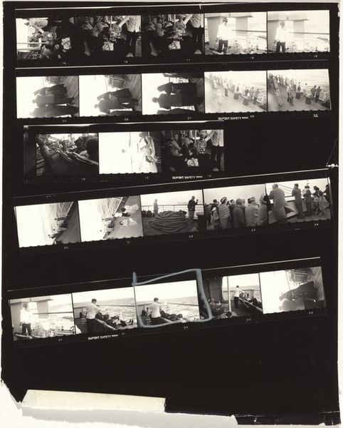 Curator: Here we have Robert Frank's "Vienna--Early Europe 11," a gelatin-silver print from 1949. It’s a series of frames, a contact sheet showing different scenes, seemingly from daily life. Editor: My first impression is fragmentation. The individual images, trapped within the grid of the film strip, speak to a sense of lives observed rather than experienced. The contrast of the bright scenes, offset by the opaque darkness of the base, is almost brutal. Curator: That fragmentation speaks to Frank's larger project of capturing postwar Europe. Consider the history of photography itself—the contact sheet is traditionally a step towards a final, chosen image. By exhibiting the whole strip, he rejects the idea of a single decisive moment and highlights the constant act of seeing and recording. Editor: Exactly! Look closely and you notice the graininess, the almost rough quality of the silver. These weren't meant to be slick, easily digestible images. The visible process makes you confront the materials and labor, forcing you to recognize it is more than just a neutral, captured "reality." Curator: The locations shift. Indoor scenes of people reading, maybe in a classroom or library, contrast with outdoor views of a waterfront. The implied narratives seem incomplete. It’s as if we’re being presented with visual evidence of something we can’t fully grasp. The lack of resolution emphasizes the inaccessibility. Editor: I'm especially struck by the scenes depicting interiors and public gatherings, juxtaposed to those lonely open water shots. He shows the communal need alongside natural abundance; what they consume in tandem with what the world produces. It’s less about pretty architecture and more about this balance that these early European populations maintain. Curator: His street photography is social realism in action; he offers us not a romanticized view, but a slice of ordinary lives impacted by recent and lingering traumas. The choices, from camera settings to printing, emphasize that perspective. The work embodies his feelings, reflecting his position as an outsider both in his new home in America, and when traveling back in Europe after the war. Editor: By revealing every part of the process, Frank democratizes image making and creates space for new modes of interpretation. He seems to suggest a call for viewers to become conscious producers of the very environments we exist in. Curator: Ultimately, "Vienna--Early Europe 11" isn't just about documenting a time and place, but about exposing the raw and unfinished nature of history itself. Editor: Absolutely. It forces us to consider the material conditions that shape our view of that history and consider where to go from here.