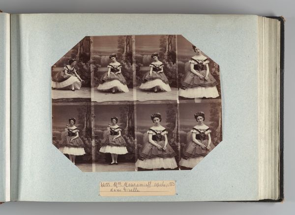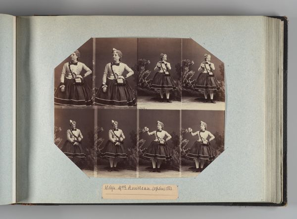 Editor: This is a photo album page from 1863 by André-Adolphe-Eugène Disdéri, featuring albumen prints of performers titled "Mlle Ribert; Gabiot; Perrot; Lecerf". The outfits are definitely… striking. What do you see in this work? Curator: This piece gives us a window into the representational practices of 19th-century opera and theatre, but I'm particularly interested in *how* these identities are being presented and circulated through photography. How are gender and class being performed here, both onstage and through the photographic process itself? Editor: Performance is definitely at the core here, considering that they're performers! It’s just fascinating to think about their costumes, the social meaning of them, and how it was captured by Disdéri. It is, I think, an early form of what we call media spectacle. Curator: Exactly! Disdéri was a master of celebrity portraits, mass-producing images like these and contributing to a burgeoning culture of celebrity. So it isn't just about the costumes, it's about visibility and the commodification of identity in the photographic age. The gaze of the audience is constructed through both theater and print media. Editor: The commodification of identity... that makes me think about how these images were consumed, how that consumption reinforced gender and social roles in a pre-digital world. Do you see anything else in how identities were produced, consumed, or challenged? Curator: Well, think about the controlled poses, the staged backdrops. All those point to the artificiality of the image itself, a constructed reality that invites us to question what’s “real.” Disdéri gave us not only images of people, but an image of a time. This, in turn, can become a document for analyzing cultural constructs. Editor: So by studying these photographs, we learn as much about the social constructs as we do about the people themselves. I hadn't considered how constructed the image is and how much we can take away from understanding the artifice. Thanks! Curator: Exactly. Now imagine where we'll be in another hundred and fifty years.
