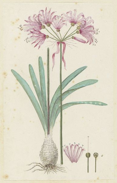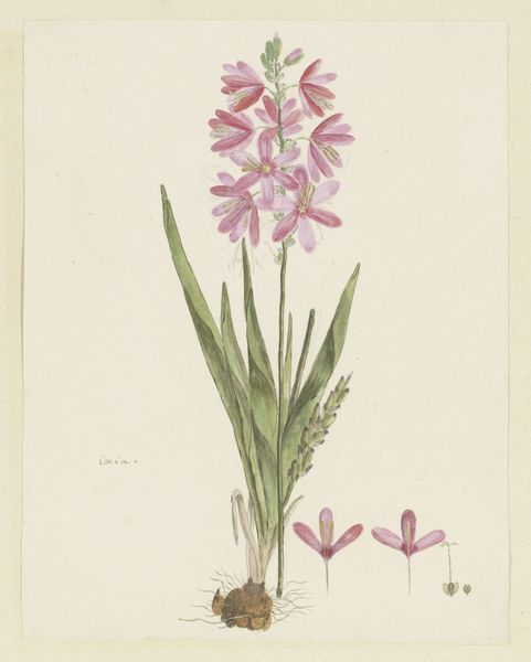 Robert Jacob Gordon rendered "Ixia lutea Eckl. var. ovata" in watercolor, showcasing a delicate balance of observation and artistic interpretation. The composition rises vertically, anchored by the bulb and roots at the base, leading the eye upwards along the stem to the clustered flowers at its apex. This arrangement imposes a structural order onto the natural form. Consider the artist's choice of watercolor; the medium’s fluidity allows for subtle gradations of color, particularly in the petals where the pigment gathers to define form and texture. This technique reflects a tension between scientific accuracy and aesthetic expression. The plant's components—bulb, stem, leaves, and flowers—are rendered with precise detail, yet the overall effect transcends mere botanical illustration. Gordon invites us to contemplate not only the plant’s physical attributes but also its underlying structural elegance, blurring the boundaries between science and art.