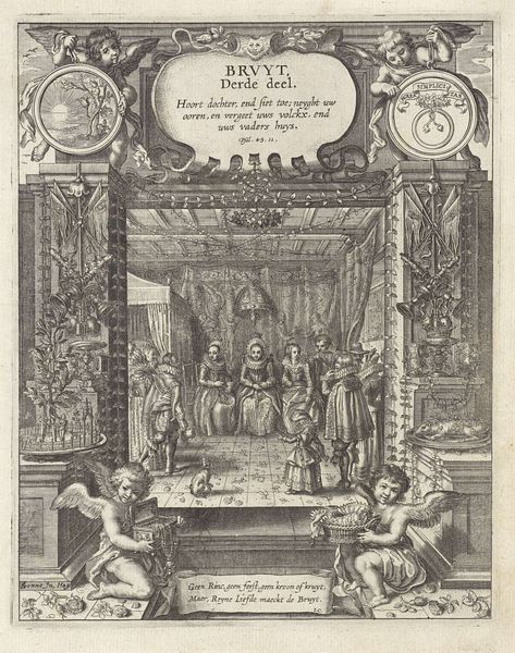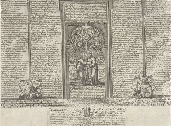Editor: So, this engraving, “The Education of Children,” made in 1578 by Hendrick Goltzius, strikes me as…incredibly detailed. A lot is going on! What particularly catches your eye? Curator: I see a potent visual argument steeped in the humanist values of the Northern Renaissance. Notice how the central scene, the classroom itself, is framed by these smaller allegorical images and biblical verses. The whole print functions as a kind of symbolic encyclopedia on proper child-rearing. What feelings does this evoke? Editor: A bit overwhelmed, if I’m honest! But also, intrigued by how all these elements fit together to convey that message of 'proper' upbringing. The verses, are they direct quotations? Curator: Precisely. Each inscription around the edges serves to reinforce the importance of specific virtues and actions— obedience, reverence, and learning from scripture. These weren't just decorative elements. The artist sees cultural memory encoded and disseminated through these very specific visuals. This continuity helps ground what they might be going through psychologically and even intellectually. How might the images contribute to these shared meanings and how do they intersect in turn? Editor: I hadn’t thought of it that way. So, the imagery almost acts as a mnemonic device? A way to constantly reinforce these values and shape young minds. It’s quite powerful when you consider the long history it creates and preserves through cultural memory. Curator: Exactly. And this cultural continuity makes one wonder, how do such methods compare with present day teachings? Editor: That is quite something to reflect upon, especially considering current teachings versus that from the past. It shows a continued value system albeit executed differently!