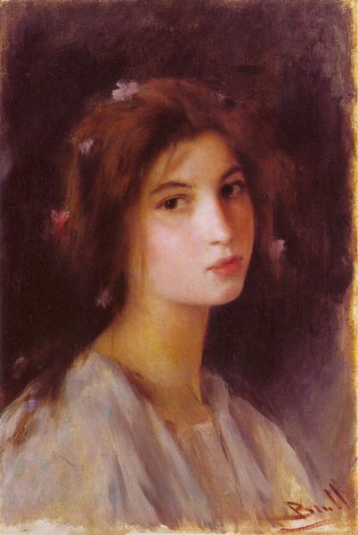 Curator: This is Eugen von Blaas' "Gypsy Girl", an oil on canvas painting. What catches your eye first? Editor: The model's gaze is very compelling; she looks a little apprehensive, even burdened, despite the vibrant colors surrounding her face. It strikes me as melancholic. Curator: It is certainly evocative. Consider how von Blaas, known for his idealized genre scenes, positions the figure. Her vibrant shawl, almost a symbol of perceived Romani flamboyance, contrasts with her subdued expression. Do you think that contrast carries intentional meaning? Editor: I think that juxtaposition is very important. I find it to be unsettling how the painting romanticizes an ethnic identity through the young woman’s perceived exoticness without giving any representation to the difficult and historical reality surrounding her identity. Her beauty is rendered for the sole sake of display, an example of art for the male gaze. Curator: Indeed. And in those images, the shawl becomes more than just fabric; it transforms into a marker. We should observe how patterns have been used in different eras and social settings to communicate everything from status and beliefs, to, perhaps problematically here, an entire cultural identity. Editor: That’s right! By isolating her in the composition, we almost strip away the background necessary to understand the cultural narrative of which this character may actually be a part. What purpose do you think this visual fragmentation of identity is supposed to convey? Curator: Perhaps it served to distill the ‘essence’ of Romani identity into a single figure for the viewer. Think of academic art and romanticism's interest in the “picturesque”. Although beautifully painted, one could say that it might reinforce stereotypes rather than fostering a genuine understanding. Editor: Yes, you've made a very important point. Her perceived otherness becomes an aesthetic object divorced from political awareness. This kind of practice in the visual culture of art, I feel, demands a critical review that centers contemporary social commentary and ethics. Curator: Thank you for drawing attention to those issues; the history of portraiture is not free from them. The piece invites us to reflect on the complex relationship between the artist, the model, and the cultural context they both occupy. Editor: Right, and hopefully inspire future cultural representations with more sensitivity and respect.