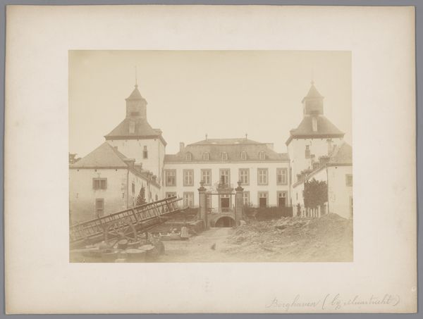 Editor: So, this photograph, "Binnenplaats van de boerderij bij Kasteel Schaesberg," likely taken between 1890 and 1920 by an anonymous photographer, depicts the courtyard of a castle. The mood is a bit muted, a little… industrial, almost? What do you see here, looking at this through your lens? Curator: Well, what immediately strikes me is the depiction of labor. It’s not just the castle as a site of power, but the surrounding materials and tools that speak volumes about its upkeep. Look at the carriage, the hay – all the things needed for its economy to function. Do you notice the textures in the photograph? The rough stonework against the smoother rendering of the paper itself? Editor: Absolutely, the contrast is really telling. It brings the tactile qualities to the fore. Is that intentional? Curator: I think so. The very act of photographing shifts the perspective. We aren’t simply seeing the castle, but observing the means by which the artist chose to record it. The tones are deliberately muted, directing attention not towards the architectural grandeur, but instead to the everyday tasks involved. Even the placement of equipment feels calculated, inviting viewers to consider its function as it sits within this site. Editor: That makes a lot of sense. It is very much like a historical record, with that raw, documentary feel to it. So, what did you make of the decision to keep the photographer anonymous? Curator: The anonymity allows us to focus on the material history recorded rather than being influenced by the brand and artistic licence. The means of its creation: paper, emulsion, time… it all encourages a consideration of class, means of production and how even the everyday image has inherent socioeconomic worth. What has it all done for you? Editor: I think I'm starting to see how the choice of material, and even the lack of a known artist, shapes how we understand the photo. It becomes less about romanticism and more about the tangible realities of life at the time. Thank you!