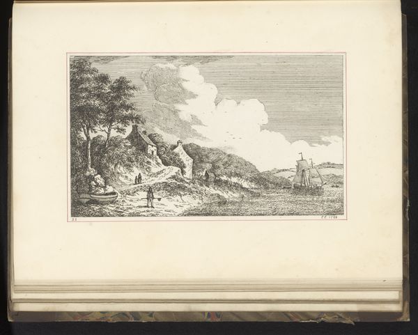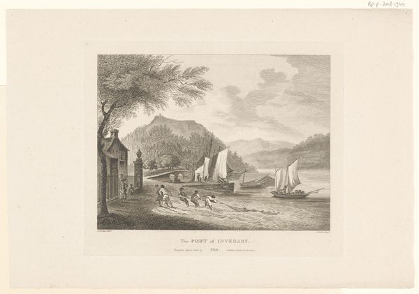 Curator: Before us hangs "View of a River of Goa, near Makassar," an engraving by Quirijn Maurits Rudolf Ver Huell, dating from 1824. Editor: The light in this piece is captivating! The misty quality of the background really creates a sense of distance and scale. But tell me more about the making of the print itself. Curator: Certainly. Consider how engravings, as repeatable images, spread ideas of empire. They are visual technologies but also carriers of culture and ideology. We might ponder what Goa—or the concept of Goa, and by extension the East—represented to its original European audience through images like this. Editor: Absolutely. Looking closely, one can appreciate the labor invested in each line, each etched detail. But also, this piece feels… conflicted. Romanticized nature, yes, but human figures reduced to repetitive forms. And pulling boats along by rope looks hard. Curator: Think about it through the lens of Orientalism and Romanticism. The image captures both the allure of the exotic East, but also its potential to be mastered and used. The very act of depiction is loaded. Editor: But it's also, visually, beautiful. Those palm trees, and that dramatic sky – it suggests adventure, the exotic, the unknown... all rendered accessible through careful work. The people and their vessels contrast sharply. Are those vessels, in the context of material study, evidence of global exchange or imperial plunder? Curator: Perhaps, a bit of both? How do symbols of cultural contact operate as triggers in our present day. Ver Huell is not simply presenting a scene; he's curating a specific interpretation, influencing the European view of the East, whether consciously or not. Editor: The material legacy then goes beyond the ink and paper. It becomes a visual artifact within complex systems of production and consumption. What are we consuming as we examine it now? Whose perspective dominates? Curator: Indeed, its enduring power resides in its ability to stir up all these thoughts about seeing, knowing, and possessing distant lands. Editor: And remind us of the labor that is hidden behind what looks picturesque, prompting reflection on who gains and who loses in this visual economy.