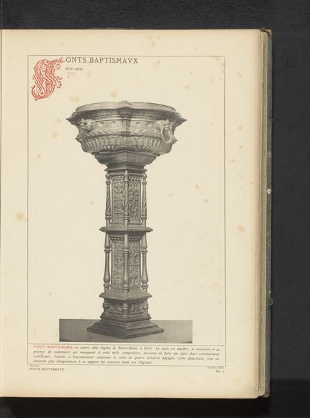 Curator: Here we have an image of the Koperen doopvont in de Sint-Bartholomeüskerk in Luik, België—a baptismal font, specifically the copper font inside St. Bartholomew's Church in Liège, Belgium. It's believed to date from before 1887. Editor: It has a rather stoic, powerful aura. Even in this photograph, the textures are striking. You can really see the hand of the artisan in the rough tooling marks across the surface. Curator: The Romanesque style reflects the tumultuous politics of the era. Baptism signified not only spiritual cleansing, but incorporation into the dominant power structures. Can you imagine the power dynamics at play? Editor: Absolutely, I agree. This wasn’t just a symbolic washing away of sins, it was the material creation of new social identities. What's it made from, originally? Bronze, is it? You know the copper alloy allows such refined sculptural elements with those small details of the animal heads at the bottom. The amount of labor, too, that's invested in each baptismal font… Curator: Precisely. Consider also the visual narratives depicted. The act of baptism being prominently featured is, of course, meant to convey very particular messages about morality, redemption, and the divine, and who had the authority to enact that symbolism within this socio-political structure. These narratives served specific didactic purposes that spoke to questions of gender, family structure, and even governance at the time. Editor: It's impossible to ignore those economic and labor considerations, those systems in which raw materials become a valuable artistic and symbolic artifact. That transformation and those figures embedded within it is precisely how art shapes societal meaning. Curator: Ultimately, appreciating it necessitates confronting both the aesthetic grandeur and the subtle encoding of religious authority that dictated the realities of many. Editor: Well put, I think what strikes me is considering the conditions and processes it took to form these very real and meaningful transformations.