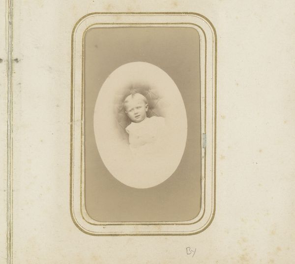 Curator: Looking at this artwork, one immediately confronts the sheer weight of early photographic portraiture—the pressure to perform permanence. Editor: It certainly evokes a specific somberness, doesn't it? The Portrait of a Baby, made with photography between 1870 and 1890 by Confeld von Felbert, it is so fragile! The muted tones and aged texture speak volumes about the past. Curator: Indeed. Photography at this time was an industry striving to depict permanence, capturing likenesses in the face of constant loss. And, look at this infant's gaze: solemn and unfathomable, embodying an echo of our collective past. We should consider how photography as a tool served specific ideological agendas. Editor: The baby's serious expression also brings forth so much compassion. Perhaps a modern eye looks at it, and the very young person embodies so much truth, that it forces feelings of sorrow to surface... Was it common to depict infants looking solemn back then, as part of popular imagery? Curator: Child portraits were heavily coded; seriousness projected a kind of ideal citizen in miniature, part of this era where progress depended upon societal performance. It contrasts deeply with how childhood is represented nowadays. The framing, a standard form, suggests wider access to photographic representation. But it begs questions: who commissioned this image, and how did they hope this representation will be perceived? Editor: And how the fragility and fleeting nature of early childhood intersect with the heavy permanence granted through photographic technology! To have a frozen frame and fixed view on something always in motion, someone always growing... It strikes me as a deeply philosophical contradiction, worthy of contemplation. Curator: These echoes are what haunt these historical portraits. They are more than personal; they symbolize shifts in power, technology, and cultural memory itself. And now, this piece becomes a mirror, inviting us to reflect on these ideas with present-day considerations. Editor: Absolutely. There is still a profound connection between us, even with this historical gap, because humans want to be remembered, despite life's brevity and change, as individuals or as societies.
