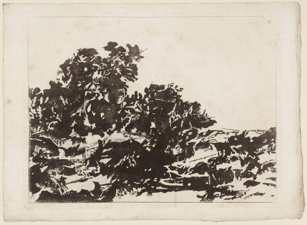 Curator: Here we have Alexander Cozens's "15. A Landscape of a Moderate Extent between the Right and Left Hand, the Objects or Groups Plac’d Irregularly, and No One Predominant," currently held in the Tate Collections. Editor: Well, the composition strikes me as a dark, almost brooding, terrain. It's intriguing, like a shadow play against a pale sky. Curator: Indeed. Cozens's emphasis on irregularity and the absence of a dominant element is key. Notice how the distribution of masses creates a balanced tension across the picture plane. Editor: It's as if he's captured a fragment of a dreamscape, where the forms are suggestive but not fully defined. I find it rather moody and evocative, despite its small scale. Curator: Precisely! It’s a calculated asymmetry, intended to evoke feeling rather than represent a specific location. Editor: It nudges the imagination rather than dictating a scene, doesn't it? A lovely balance of darkness and light. Curator: A thoughtful and evocative piece, indeed. Editor: Yes, one that lingers in the mind's eye.