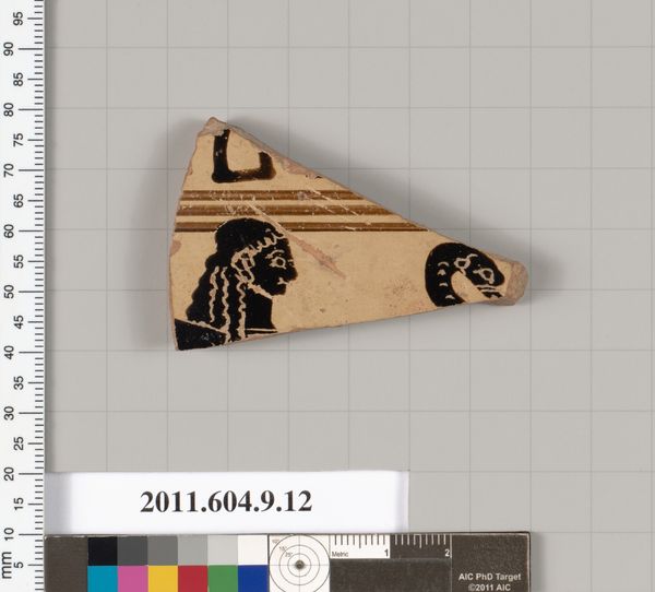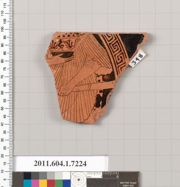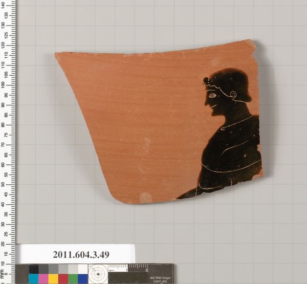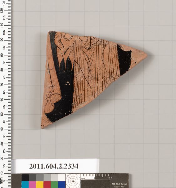 Editor: Here we have a fragment from a terracotta kylix, a drinking cup, dating back to 530 BC. It’s attributed to Douris. The broken edges give it such a sense of fragility, yet the black figure drawing is still so strong and clear. What stylistic choices stand out to you? Curator: What intrigues me foremost is the stark contrast between the red ground and the densely applied black glaze. Observe how this chromatic dichotomy shapes the very definition of the figure. The linear precision of the folds in the drapery plays against the solid black of the background and of the figures themselves, creating both depth and graphic flatness simultaneously. Editor: So, it's the contrast itself that creates the interest? Curator: Precisely. The artist masterfully utilizes the restrictions of the medium – the ceramic itself and the limited palette – to build a sophisticated composition. Notice, also, how the deliberate positioning of the figure—only partially preserved—within the fragment prompts questions about the larger, original narrative. Do you think the artist manipulated line quality for narrative purposes? Editor: Maybe! It's amazing to think about the level of intention put into a drinking cup, even the fragment we see today. Curator: Indeed. It reveals how the ancient Greeks perceived art: not merely as representational, but as an intricate interplay of form, material, and function, all meticulously calculated. What does the linearity do to express form in this instance? Editor: It does so much. Looking at this fragment has highlighted how the artist manipulated the figure to give such emphasis and tension to a shape. I've really learned a lot today. Curator: Likewise, understanding the fragment challenges us to go beyond the literal depiction to recognize its intrinsic, formal power.