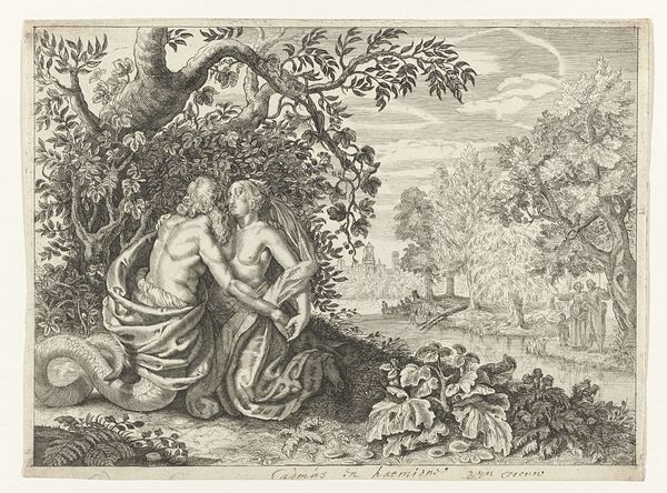 This engraving by Crispijn van de Passe the Younger, made around the early 17th century, presents a scene teeming with pastoral and mythological tension. The detailed lines and contrasting shades immediately draw your eye to the entangled lovers, Acis and Galatea, sheltered beneath a dense tree. The composition is cleverly split, with the lovers in the foreground and a landscape stretching behind. The landscape is not merely a backdrop but an active participant in the drama. The gaze is led by the river into the background, where the figure of Polyphemus lurks, watching the lovers. The engraving’s structure reveals a story of voyeurism and impending doom. It uses the formal qualities of line and space to underscore the narrative, turning a bucolic scene into one charged with eroticism and danger. Notice how the artist destabilizes the traditional landscape by imbuing it with narrative purpose. This print functions not just as an aesthetic object but as a complex commentary on desire, power, and vulnerability.