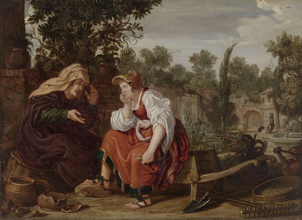 Curator: Here we have Girolamo da Carpi’s oil on panel, "The Adoration of the Shepherds", dating from about 1535 to 1540. What's your immediate take on this one? Editor: It’s… theatrical, almost stage-lit. The drama is cranked up with that single light source breaking through the darkness. I notice also a tension between idealized figures and rather… earthly surroundings. Curator: Precisely. It is a potent piece of Italian Renaissance painting. The shepherd's adoration here isn’t just about reverence; it’s also very much about humanity's raw connection to the divine. Notice the use of impasto; that tangible materiality… Editor: That materiality underscores everything! Look at those shepherds practically falling over themselves, straining, and leaning, and I keep wondering about Carpi's choice of materials – the cost of pigments, where the panel came from, and what kind of workshop he was running. Those things shape our encounters, too. It makes one wonder: what did those raw materials cost in terms of labour? Curator: Absolutely. We're grounded in the practical realities of creation. Still, observe how the landscape plays almost a character too, sheltering this momentous event. It seems at once very present yet timeless, almost dreaming its way to this specific moment. And consider the figures' gestures... Editor: Gestures that highlight the social relationships depicted within the narrative and across social groups—between those who made the oil, the shepherd's skin tone in contrast with other, nobler materials. And I like that you pointed out the landscape, because you can appreciate the labor involved not only in grinding stones for the oil paints, but hauling rocks as well... Curator: Yes, these visual components all culminate into something transcendent while staying undeniably human and made, as you say. Thank you! Editor: And thank you for the fresh insights as to the historical perspective, it allowed us to understand it more deeply!